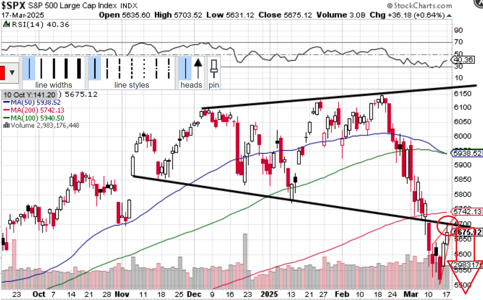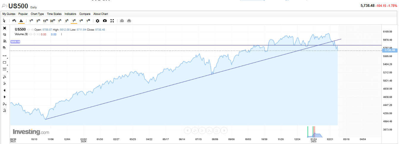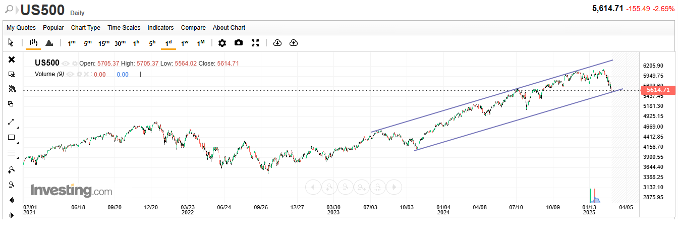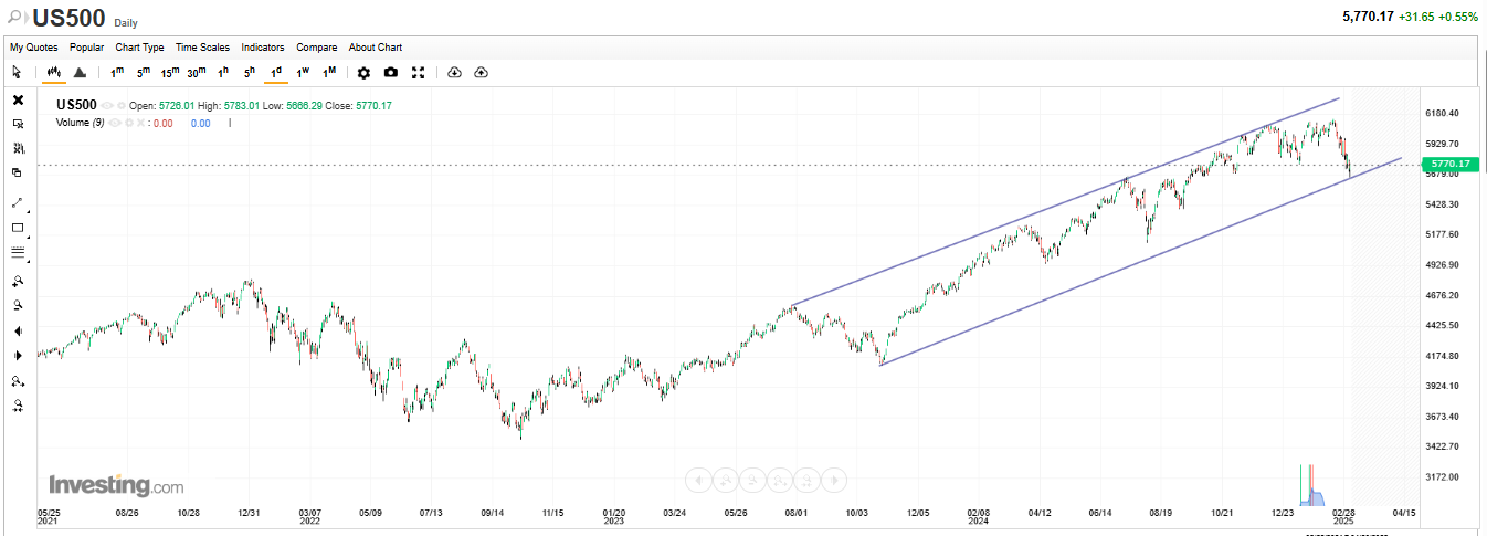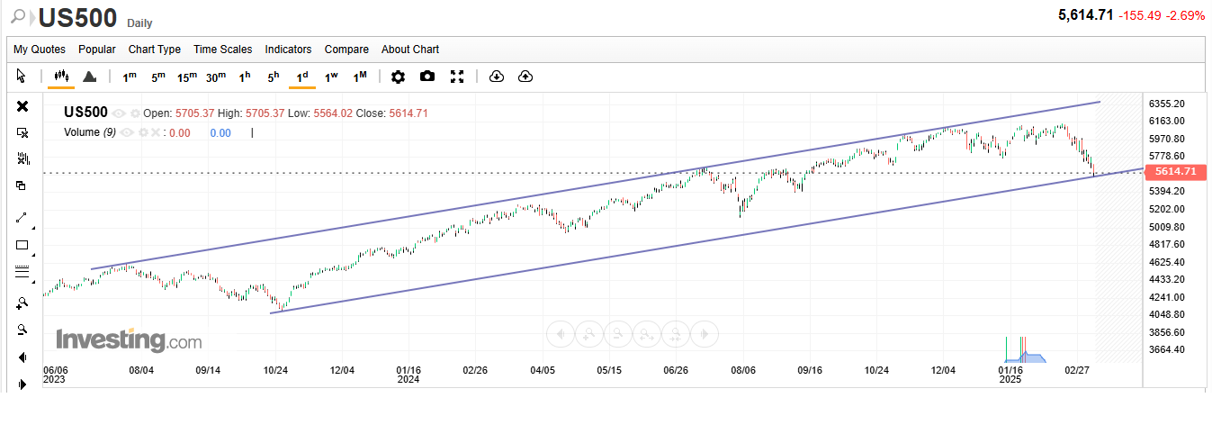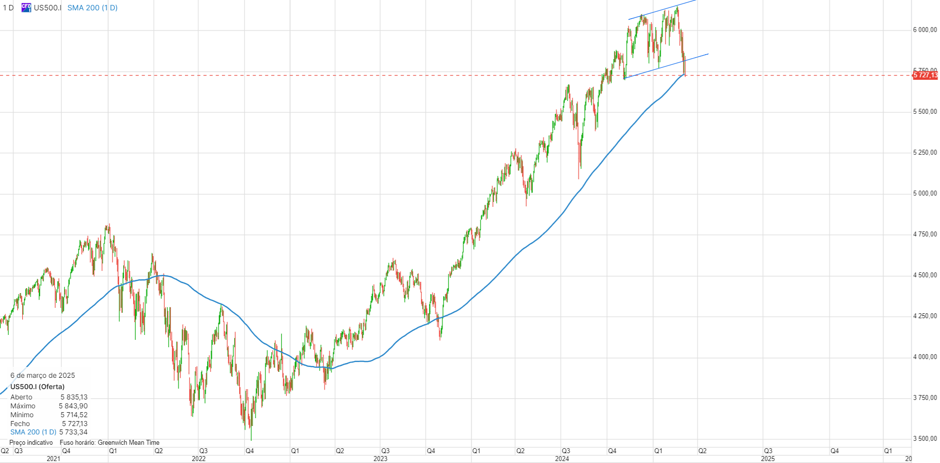 As valorizações após a eleição do Trampa do s&p, nasdac, Tesla já se foram e agora encontra-se ali numa zona crítica em cima da MM200 e muito perto de uma forte resistência que se quebrada a coisa fica foleira o que não interessa ao Trampa então lá dá o dito pelo não dito em relação as tarifas.