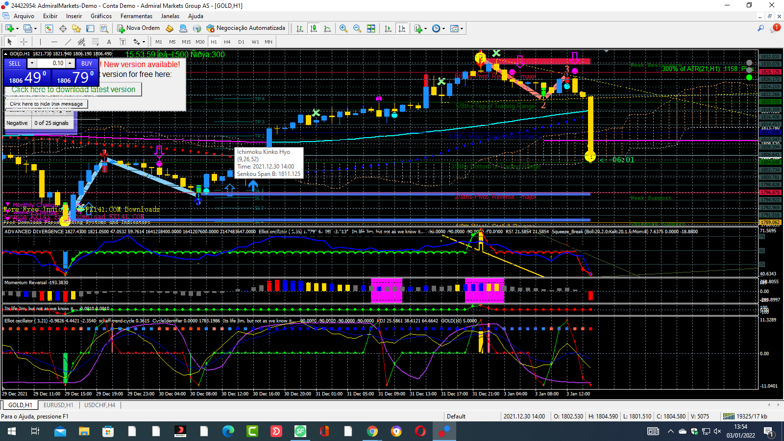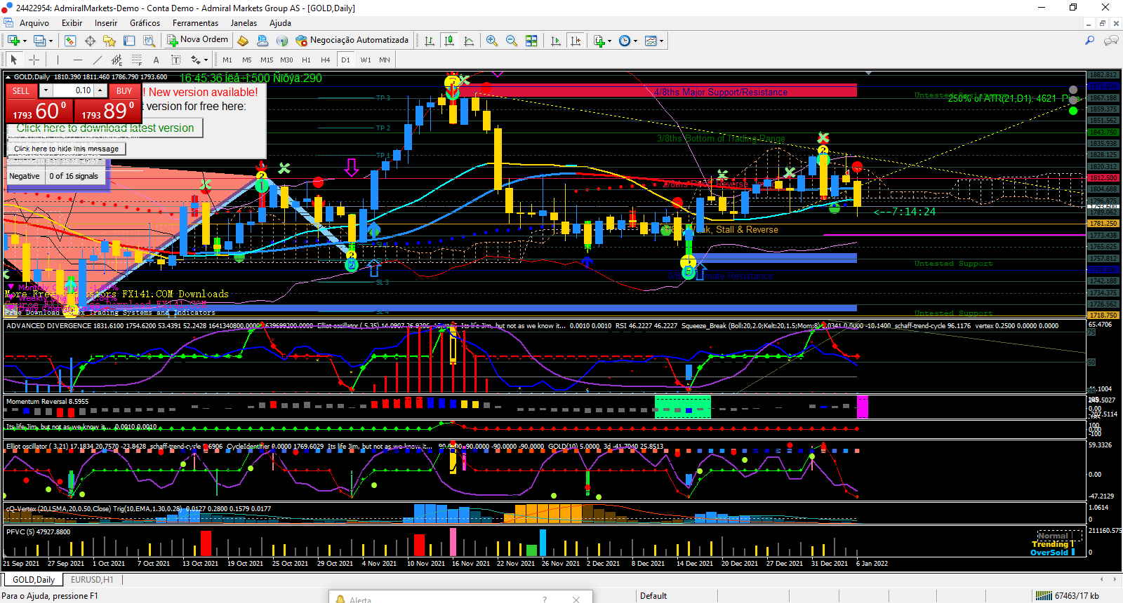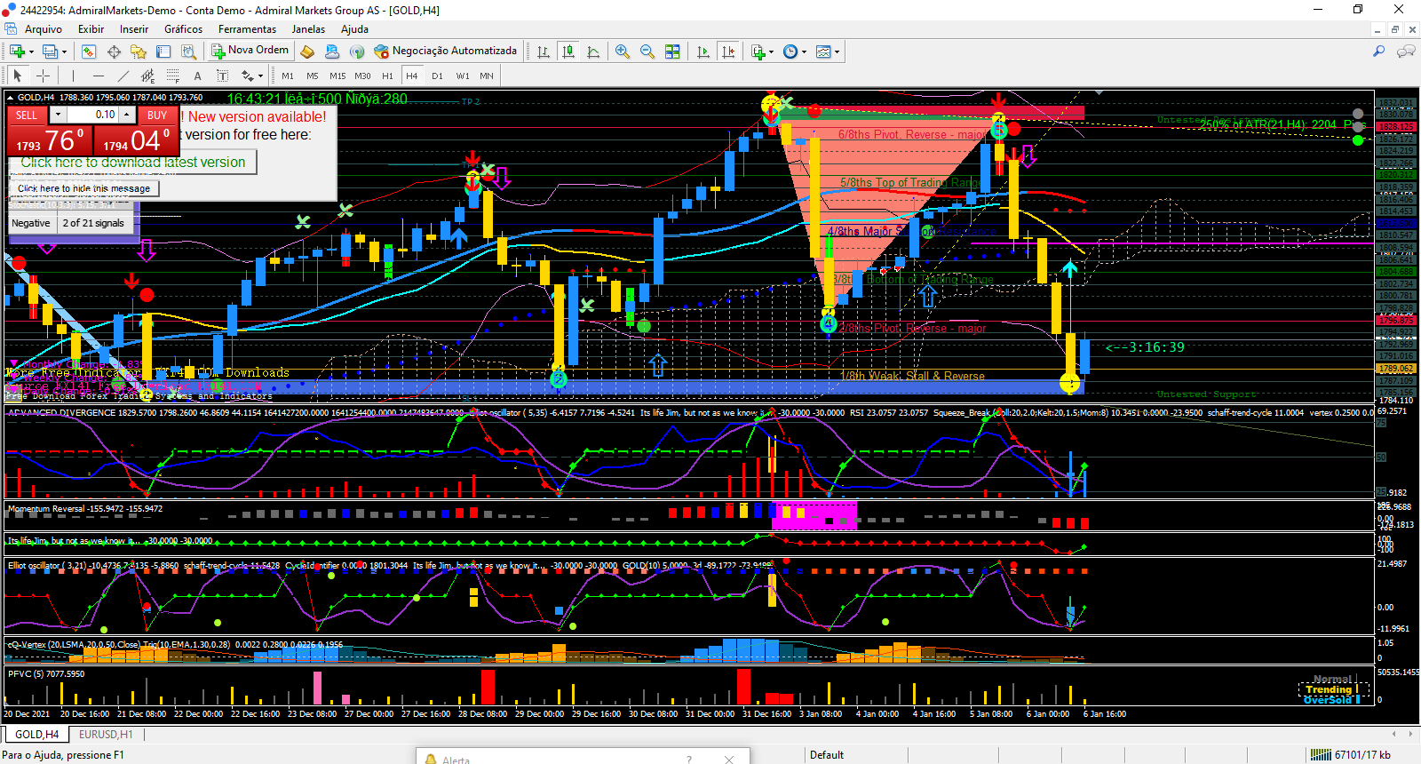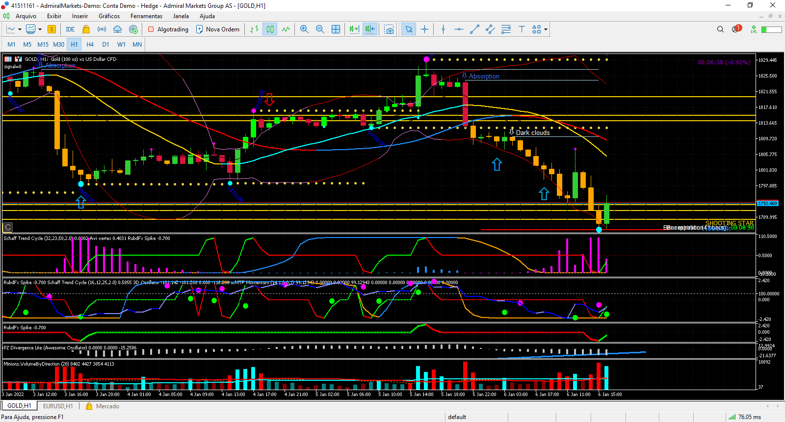 O gold no longo prazo continua Bull (grafico diario), no medio prazo a fazer uma correção com um duplo topo (grafico 4Horas), e no curto prazo no grafico horario tera chegado ao fim da correção IMHO, pois noto o indicador avi vertex (rosa) a aliviar da forte queda, e o volume começa a ser positivo (azul claro) tambem os indicadores zz de medio e curto prazo pareçem ter feito o fundo e seguirem o L.P.
