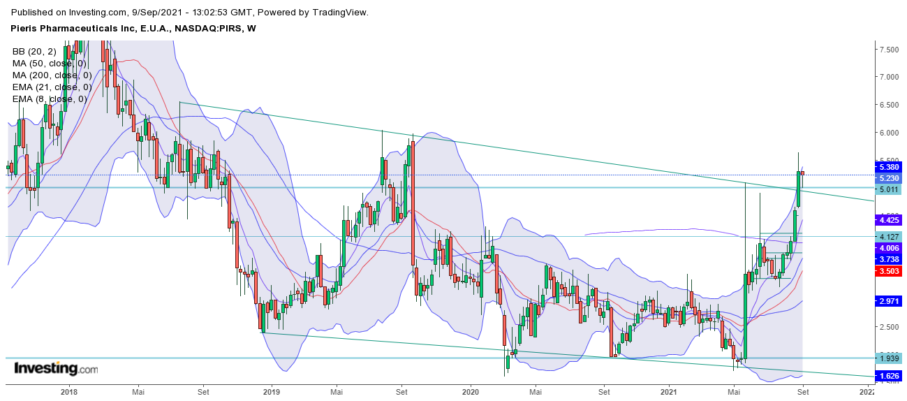 PIRS - Voltei a entrar em 3,7$ (má entrada, pois podia ter esperado pelos 3,3$, mas pronto) após a anterior subida, voltou a ganhar momentum e ultrapassou os famigerados 5$ fazendo um HH quebrando o canal de MP que tinha. Saí aos 5$, e agora estou a ver se segura a coisa, para voltar a carregar o camião. Sempre são 8 Bi em pipeline, em milestones nos próximos anos, parte em parceria com a Roche. A ver vamos. Para já, não me queixo. 2 investidas com sucesso não tá mau.