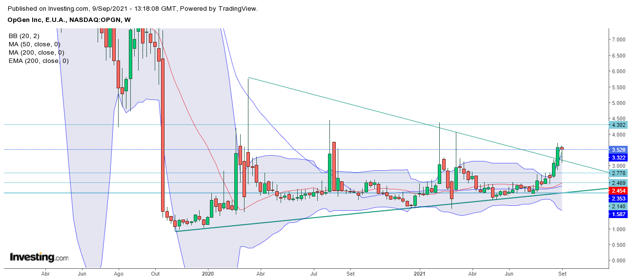 OPGN - Entrada a 2,2$ e anda nos 3,5$. A subida deve-se ao prazo que já terminou de uma aprovação da FDA que deveria ter saído até 31/08/2021. Tudo em suspenso.....nem a FDA diz que não, nem a Administração diz que sim. Tensão ao rubro. Eu incluído, pois estou com 5 dígitos nisto