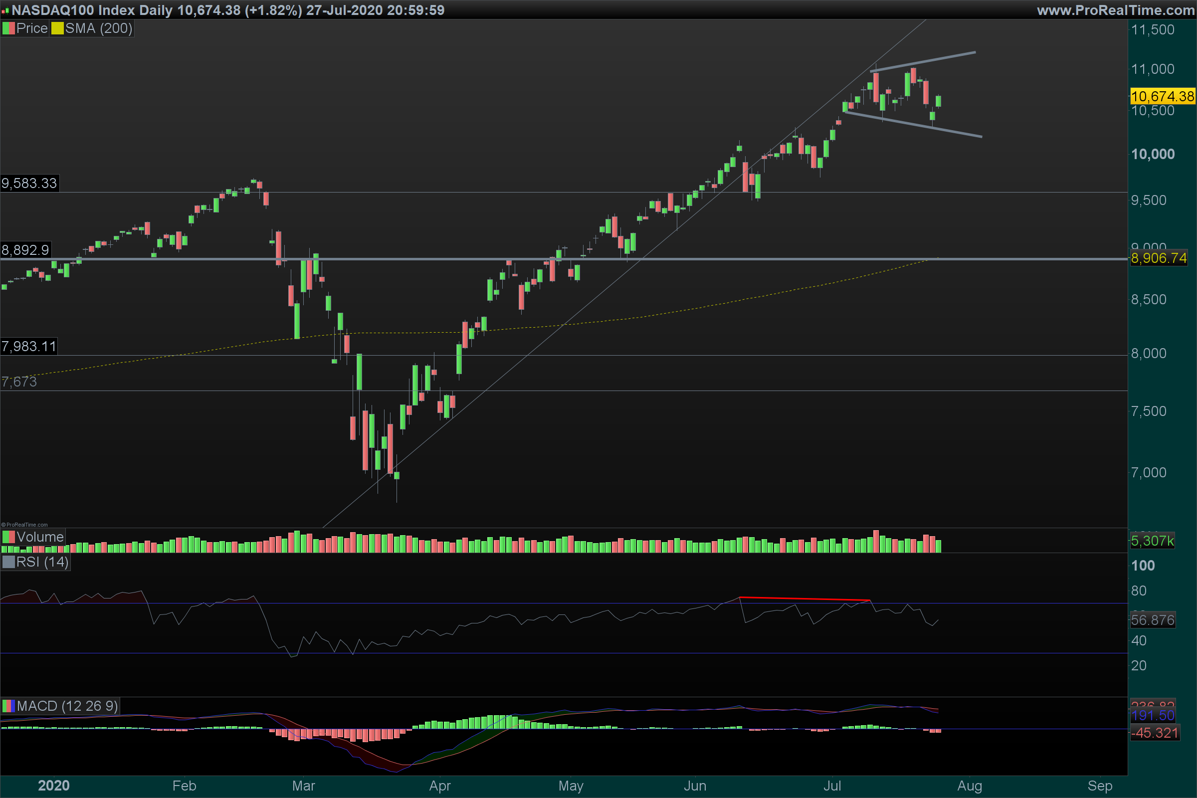 O nasdaq 100, depois de uma vela horrorosa, tem suporte na lina de tendencia ascendente que estará situada na região dos 10400.