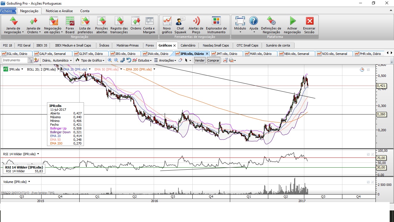 Também partilho a visão do duplo topo. A ser activado estarei à espera 0,34€/0,35€, no reteste à linha de tendência descendente de logo prazo, ou mais abaixo nos 0,27€. Com muita pena a posição que tinha na Impresa foi stopada nos 0,34€, para proteger ganhos, e perdi uma grande parte do movimento até aos 0,50€. Acho que entrar acima de 0,35€ neste título tão especulativo é muito arriscado, pelo que já foi aqui dito pelos fundamentais. Cumprimentos,
