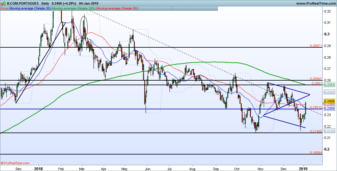 O target do triângulo que referi foi atingido, alias acabou por ir à zona de suporte dos 0,214. Para já o BCP está a fazer um ressalto, e "hoje" fechou acima da zona de resistência pelos 0,235. Mas a zona importante é pelos 0,255/0,26