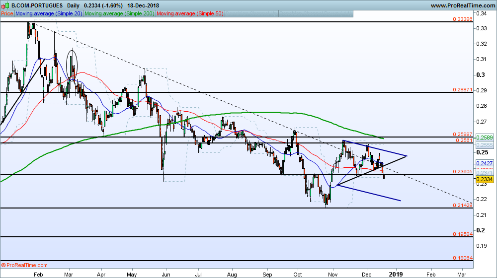 Neste momento o BCP está junto a uma zona de suporte, caso não aguente o mesma, acredito no target do triângulo.