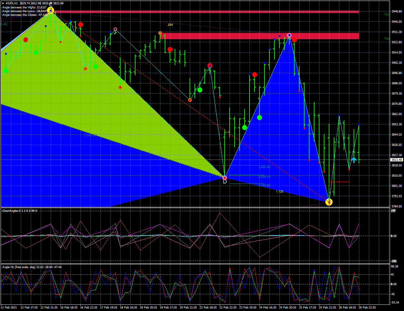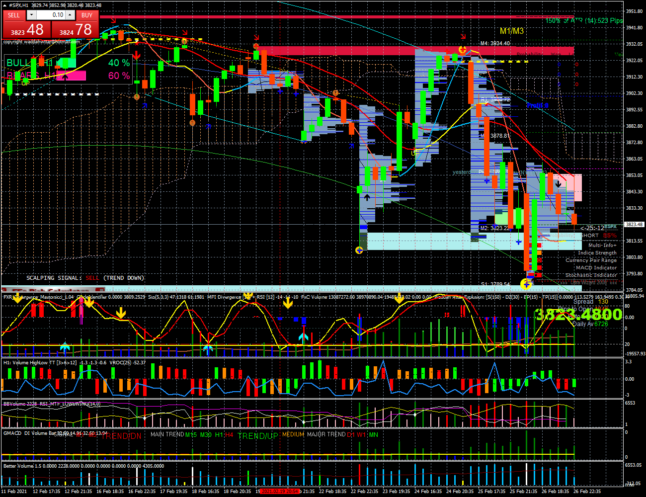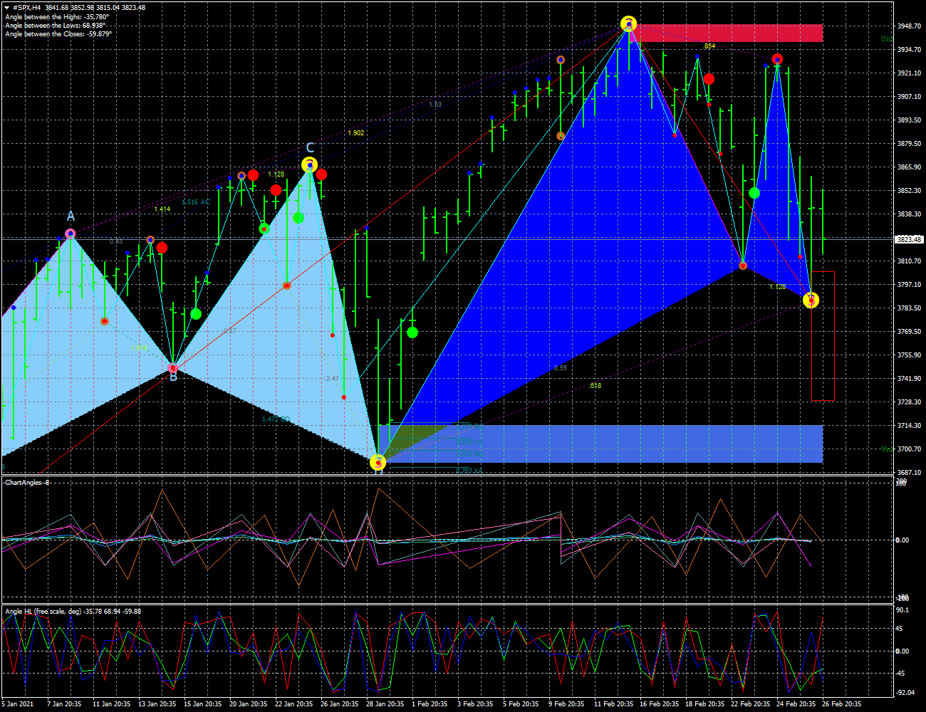 O SP500 esta numa tendencia de baixa tanto no time D. como 4H; no diario tem suporte 3700 pontos, tambem o volume o indica 24K subida e 35K de descida, no timeframe de 4H tem suporte 3665, e volume na descida 22k e 13k, na subida 16k., no horario esta indeciso, mas a tendecia diaria manda, volume subida 5k, e descida 5k, aqui a força dos touros/ursos esta equilibrada.l, deixo graficos geral c/indicadores D.4H.1H. bem como graficos de Harmonics.