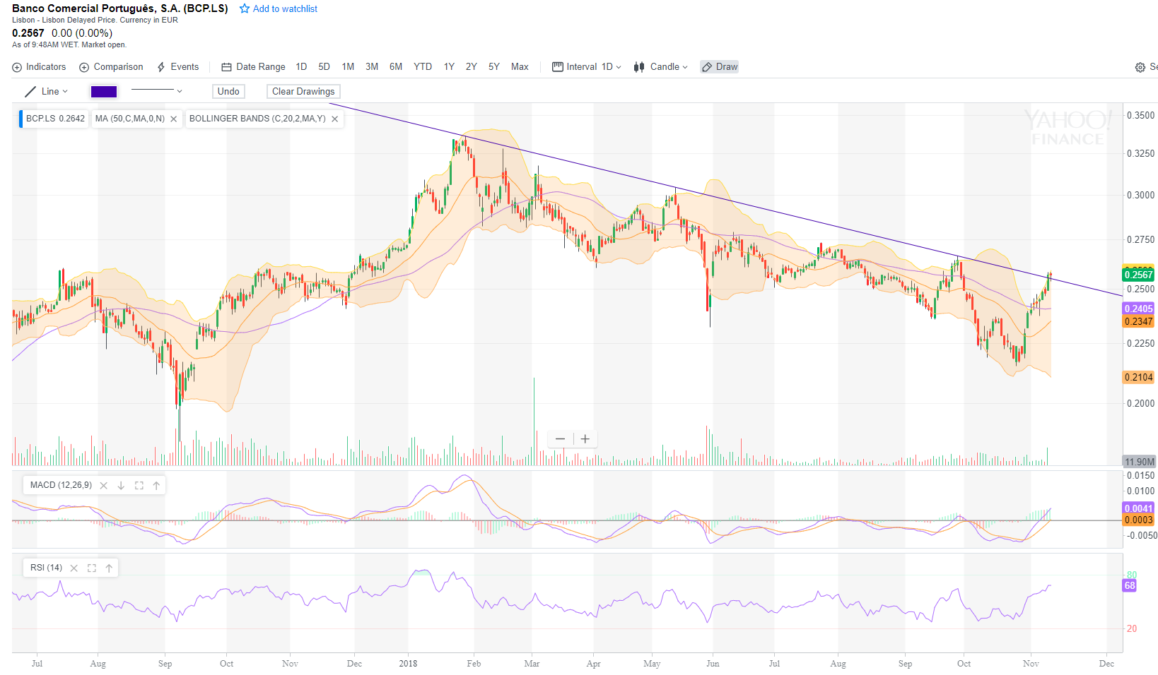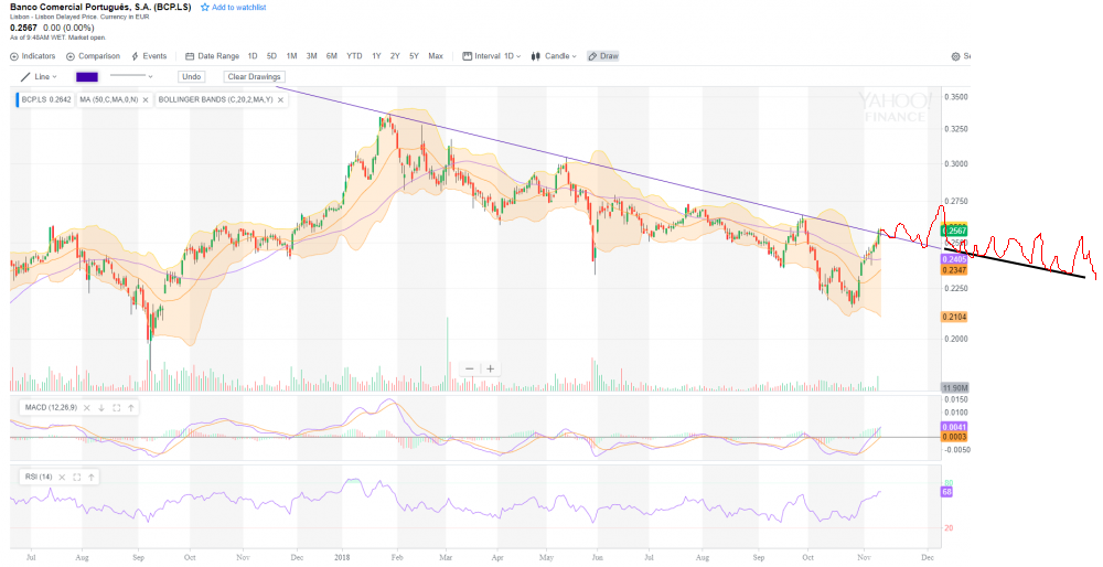 Ulisses, não concordo com a tua opinião no sentido da quebra da linha descendente passar a ser dos touros, isto porque o BCP pode quebra-la e acompanha-la na mesma na parte superior mantendo a trajectoria de bear....mostro o grafico que tirei daqui com um rabisco dum possivel futuro da ação.