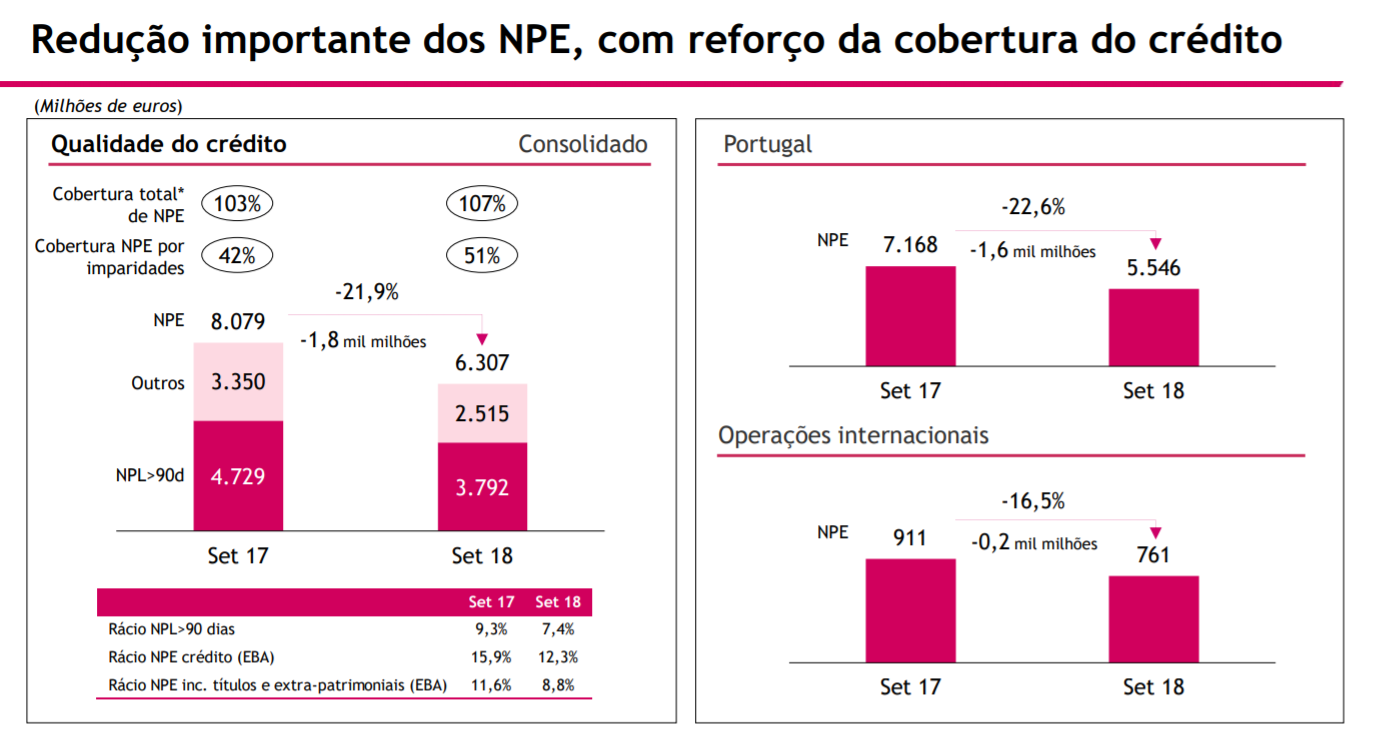 “A evolução do crédito na atividade em Portugal foi determinada, por um lado, por uma importante redução dos NPE (-1,6 mil milhões de euros face ao final de setembro de 2017, fixando-se em 5,5 mil milhões de euros em 30 de setembro de 2018”, justificou o banco. Os non-performing exposures (NPE, na sigla em inglês) inclui o crédito malparado e os imóveis.