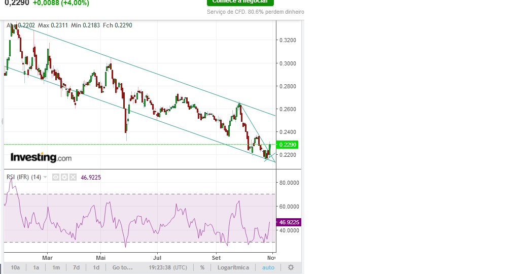 Pode ir aos 0.25? e ser um grande trade, se o superar aí é outra questão, mas se volta a quebrar os 0.23? e as bolsa mundiais continuarem o trajecto descendente, sem resultados dignos de se ver, vai aos 0.2 num instante.