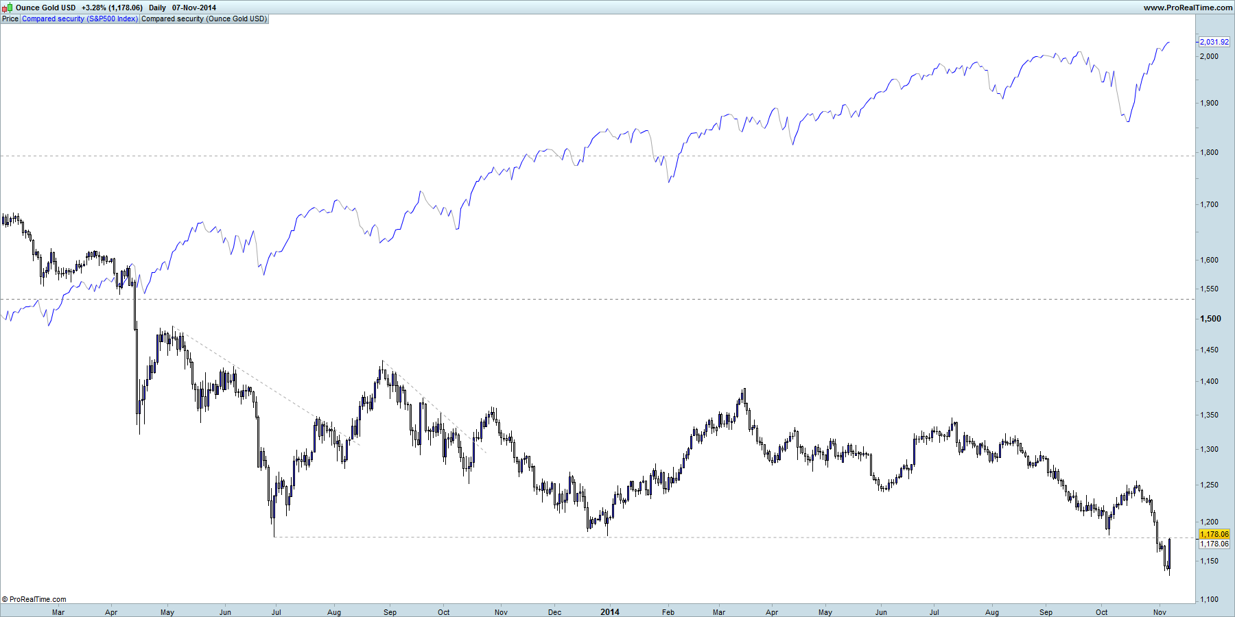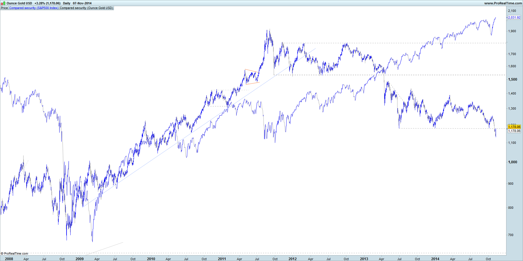 o ouro tem vindo a descer desde meados de 2011, precisamente desde que o SP500 recomeçou a subir.