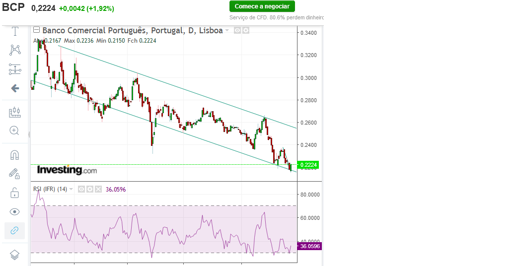 Convém, no entanto, lembrar, aos que gostam de "picar", a toda a hora, a negociação do BCP, que a cotação do BCP se mantém dentro de um canal de negociação, há já uns meses, e que, portanto, enquanto tal acontecer, é de esperar que a cotação do BCP continue a cair.