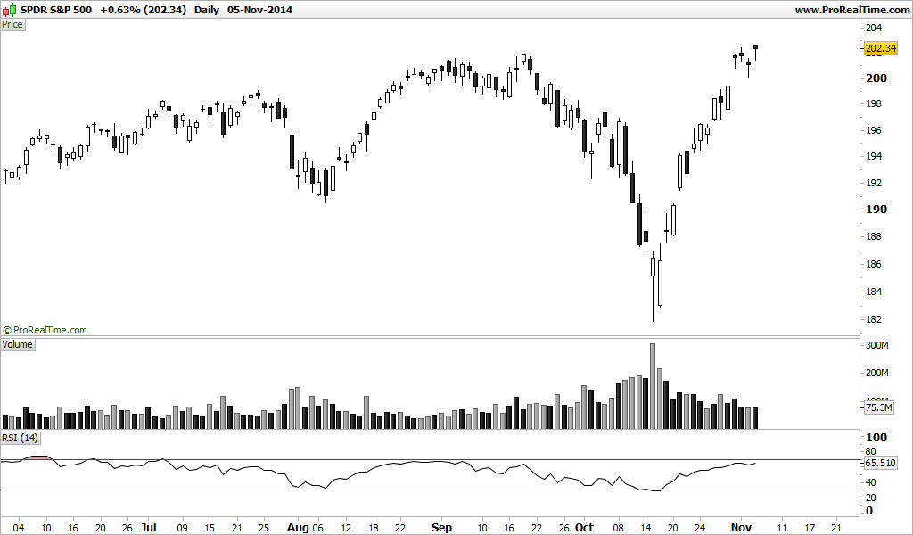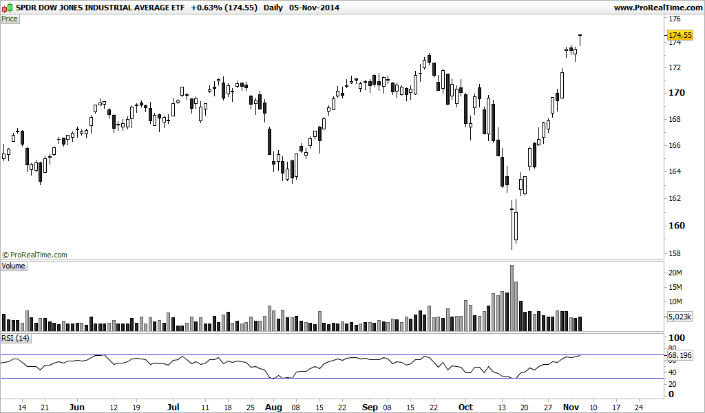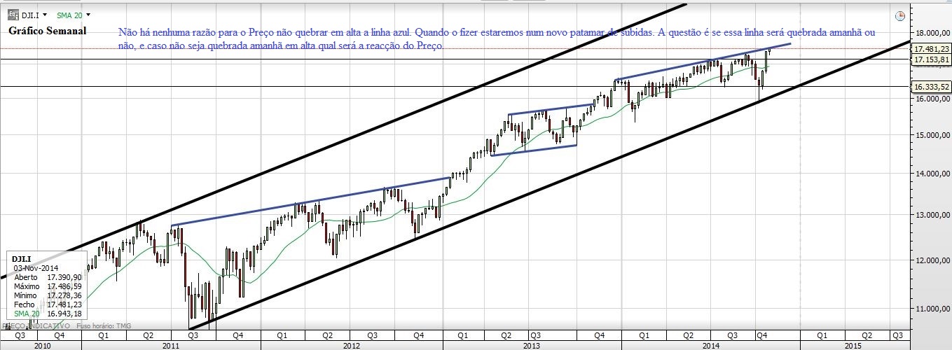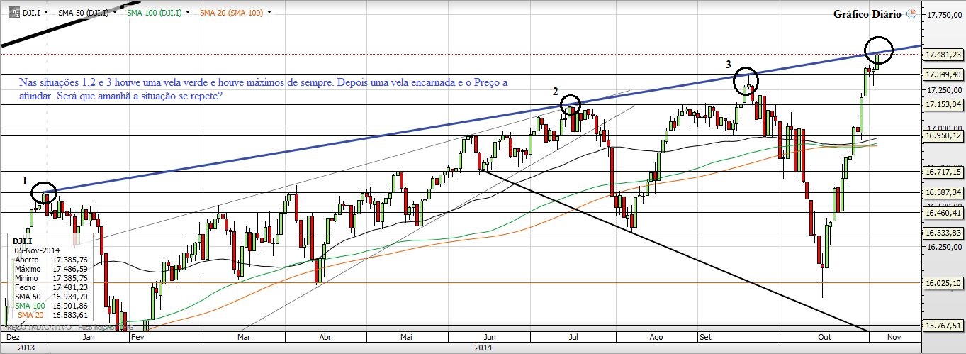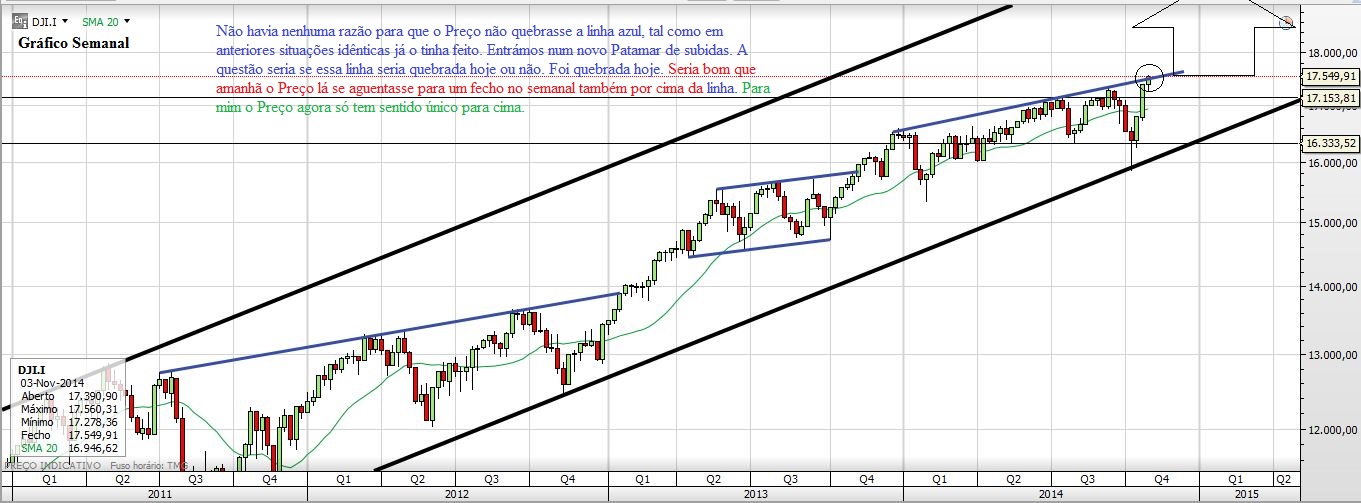 Ontem escrevi que uma linha ténue separava as subidas das descidas. Hoje essa linha foi quebrada no sentido das subidas. O DJ quebrou a linha ascendente que lhe servia de resistência, esse para mim era o ponto principal, já que, como se pode ver no Gráfico, das últimas vezes que lá tinha ido fazendo máximos de sempre era também esse o momento em que se iniciavam as quedas fortes... hoje no entanto a história não se repetiu e o Preço quebrou essa linha fazendo e fechando em Máximos de Sempre.