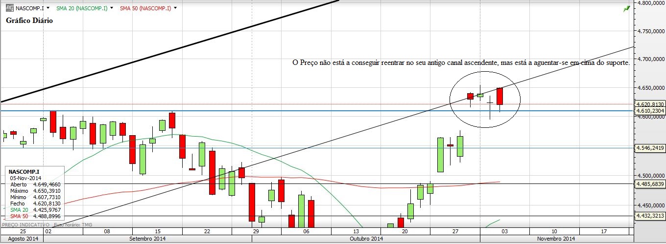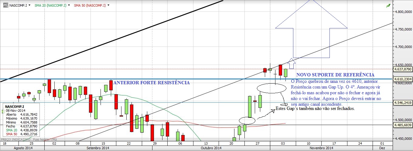 O NASDAQ não entrou no antigo canal ascendente (ainda), mas aguentou-se em cima do Suporte dos 4610. Olhando agora para o seu último Gap vê-se que o Preço saltou mesmo por cima dos 4610 para lá ficar. Por fim o S&P500 confirmou o o suporte dos 2020 e já vai nos 2030.