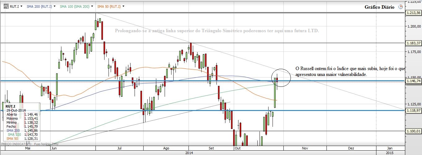 A questão é que eu não encontro fraqueza nos Índices, é só isso, eu pelo menos não encontro. No NASDAQ não encontro fraqueza e no Russell talvez tenha ali uma zona de resistência. O Preço fechou abaixo do suporte que tinha assinalado dos 1146, mas a bem da verdade aquele suporte será mais uma zona, não considero que tenha o pormenor do valor como por exemplo terá para mim os 1980 ou os 1964 no S&P500, depois a linha do antigo triãngulo poderá ser uma resistência futura... mas de qualquer maneira deveria lá ir. Se olhar para o DAX até concordo com o que o Excelso diz das cunhas etc e do sentido descendente que poderá vir a ter, mas no final o Dax segue o S&P500 e por isso mais vale ligar só a este último...