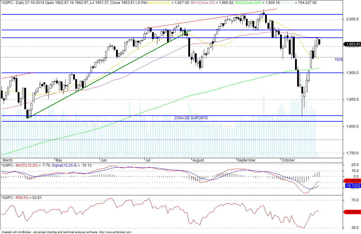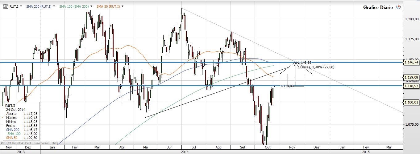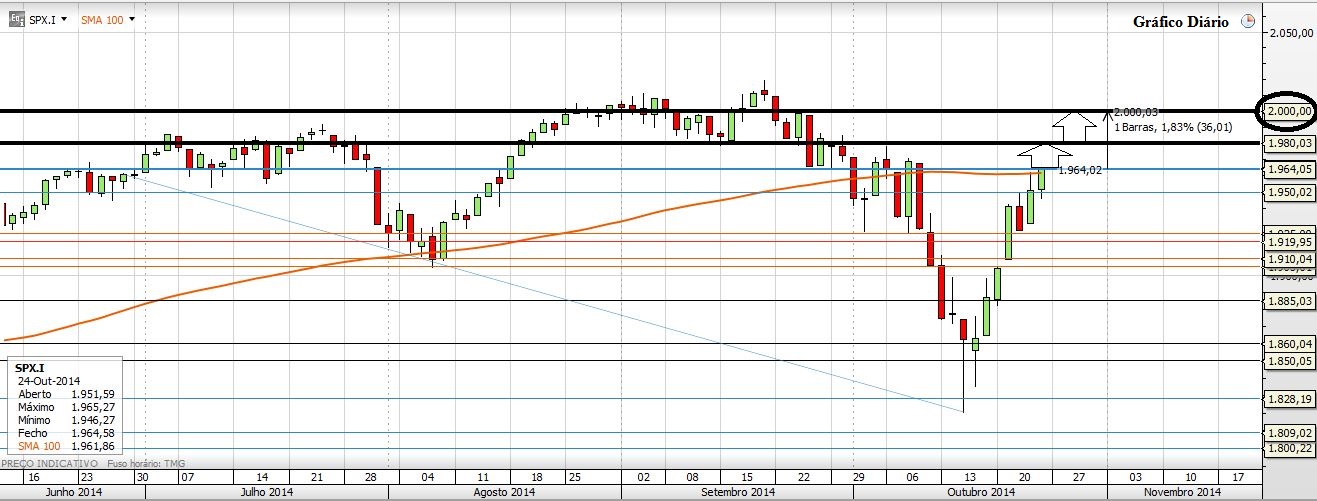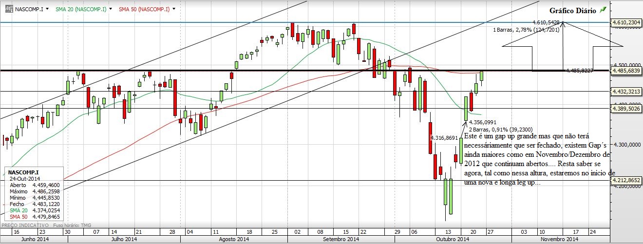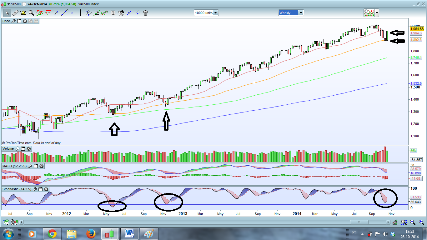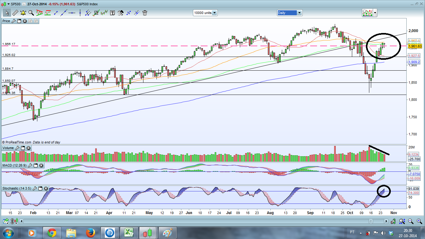 Deixo aqui o meu prognóstico para a próxima semana: A Subida. E Porquê? Em primeiro lugar por causa da vela que o S&P500 fez no semanal, depois porque no diário o Preço fechou em máximos do dia, superou os 1950, a M100 e também fechou por cima dos 1964 (um valor importante na minha óptica). Por tudo isto tem sentido o Preço ir aos 1980, esse valor de extrema importancia para o curto prazo e que se quebrado (e acho que vai ser quebrado) pode levar o Índice novamente aos 2000. Depois o NASDAQ mas também o Russell fecharam colados a fortes resistências, e pela maneira como fecharam no diário e no semanal não encontro nenhuma falta de força no Preço para que não quebre as tais resistências...