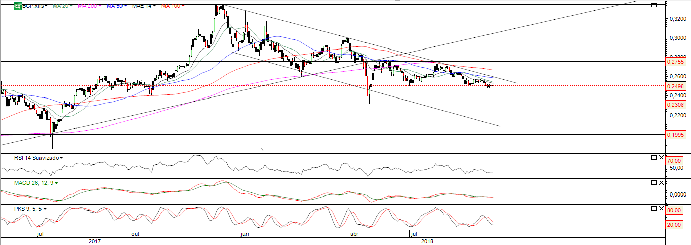 Tecnicamente, a situação é dúbia. Temos uma tendência de longo prazo ascendente e temos uma tendência descendente de curto e médio prazo. Os ursos têm ganho protagonismo mas ainda não ganharam a batalha final. Com o PSI em zona de suporte e "sobrevendido" as hipóteses de um ressalto aqui são grande mas a "big picture" no BCP é muito pouco clara. Abaixo dos 0,23 ou acima dos 0,275 as coisas tornam-se mais claras está num intervalo muito grande onde é difícil tirar conclusões.