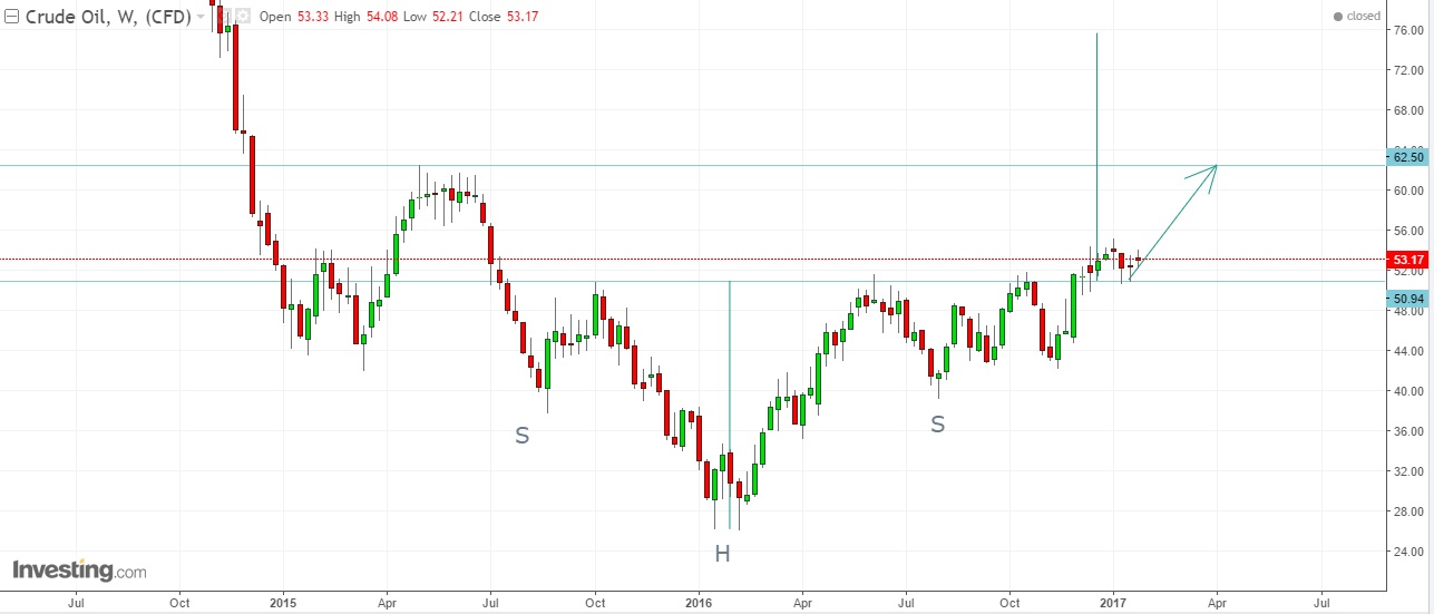 A minha visão para o petróil permanece com foco no IHS que foi activado, com projecção nos 76 dólares. No entanto, há uma zona de resistência nos 62-63 dólares, que poderá travar o preço.