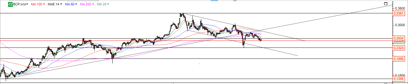 BCP hoje fechou mais uma vez , em queda e dentro da queda dos últimos dias no canal descendente devendo testar a base do canal em breve
