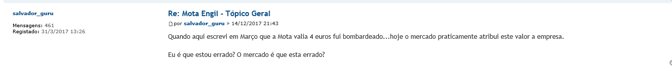 Cada um sabe de si. Eu comprei a 1,8 e vendi a 3,5. Fez um rompimento nos 1,8 e quebrou em baixa no 3,5. Foi um ganho de quase 100% em menos de 1 ano. Espero que ela faça muitas outras ondas como esta antes de ir à falência. Só não entro short porque não dá com o meu psicológico. A MOTA é muito técnica e fácil de perceber a tendência. Verifico que é quase sempre um indicador avançado do sentido do PSI20. Juntando a sonae no movimento está lá tudo. Estou fora do PSI20 e de todos os mercados até ver nova tendencia. 2017 foi muito bom sem olhar a fundamentais.