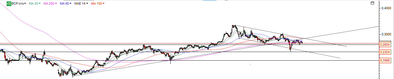 Eagle o bcp encontra-sse neste momento entre o suporte 0,26 e a resistençia ltd,mas là està em tendençias de alta de longo prazo as resistencias valem o que valem.