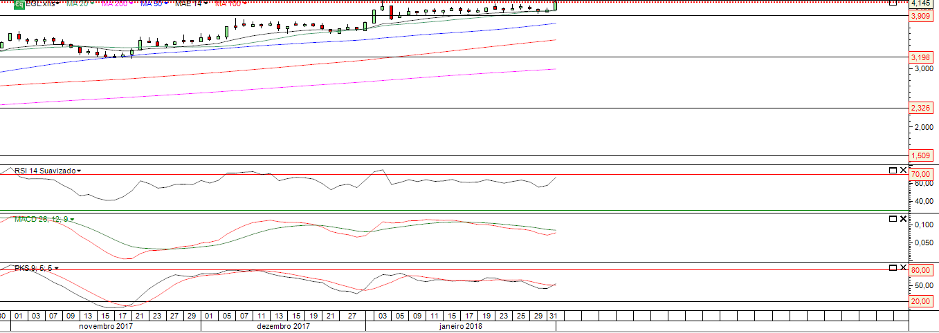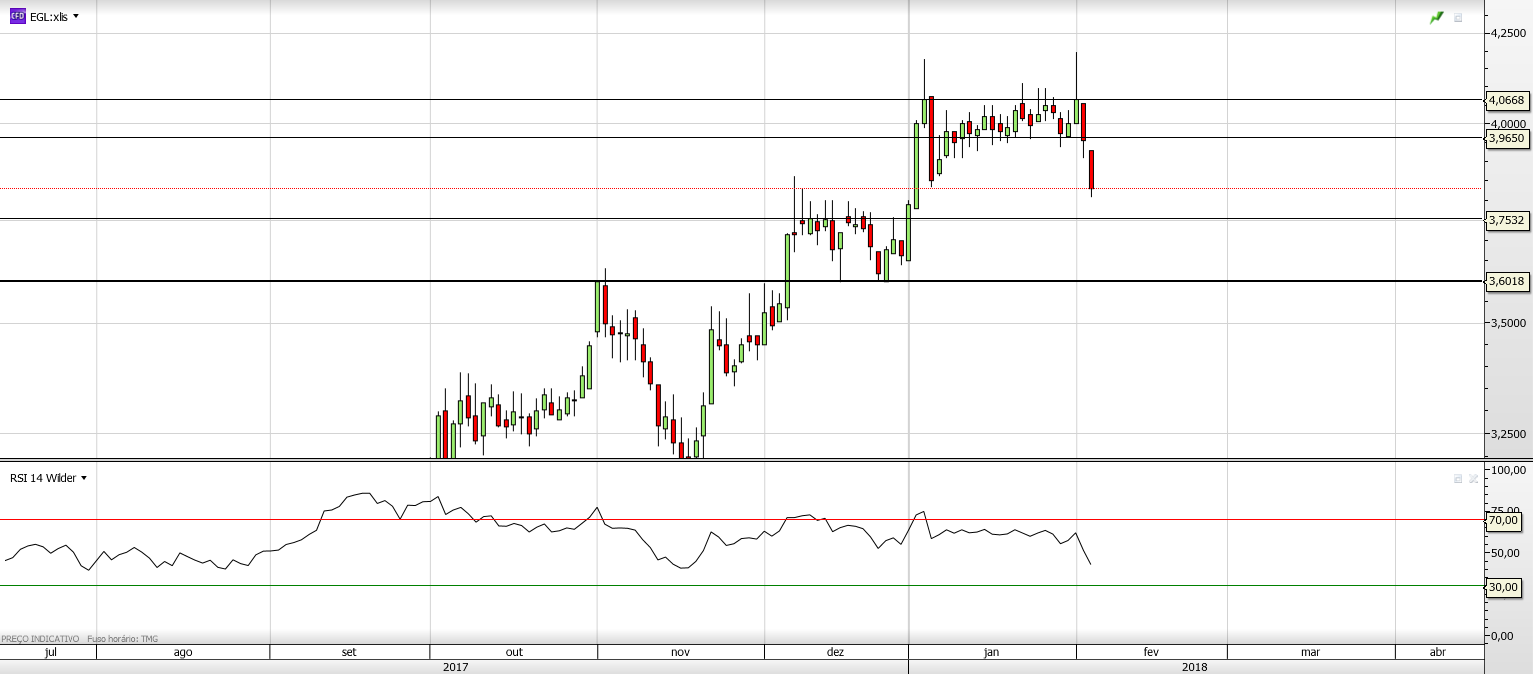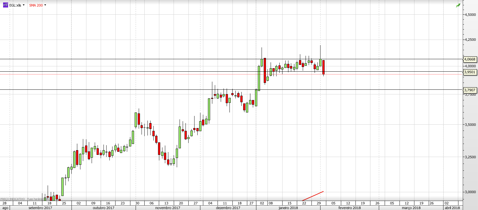 A EGL fechou hoje "encostada" a LTA, ainda na zona de consolidação, e com volume. Amanhã, se não fechar acima da LTA (4,10) e com volume, o breakout vai ficar muito comprometido