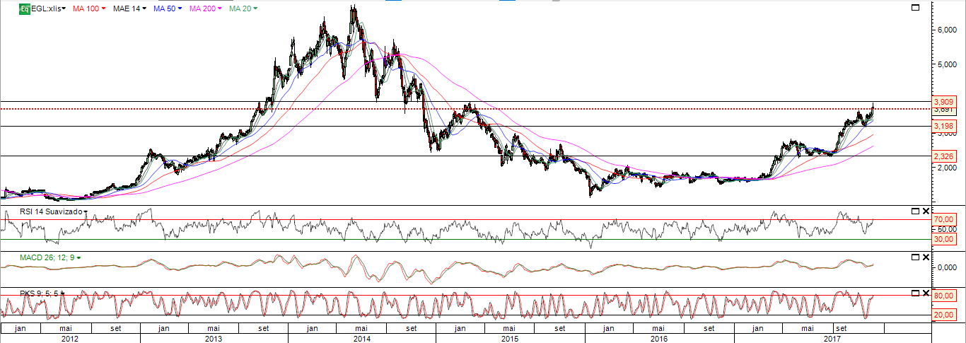 Com relação a AT, a EGL é uma ação que tem tido um comportamento técnico exemplar, funciona quase como um relógio suíço. É verdade que vender no topo e comprar no fundo não é "pêra-doce", mas se tivermos uma margem de +/- 5% de erro, dá para fazer uns bons investimentos, cujo o lucro do resultado poderá ser investido em cotadas com bons fundamentais. É verdade que em termos de AF a EGL não se recomenda, mas também é verdade que em termos de AT vai bem e se recomenda. A questão aí passa apenas por manter o sangue frio, avaliar o ponto de entrada e consequentemente o ponto de saída, e depois investir o resultado naquilo que consideramos seguro, como se tem comentado nos respectivos foruns, na IBS, ESON, STC (PSI) e em outras do contínuo espanhol por exemplo. Essa é a minha opinião particular como investidor, mas cada um deve fazer aquilo que julgar conveniente e seguro, segundo seus critérios de análise e risco.