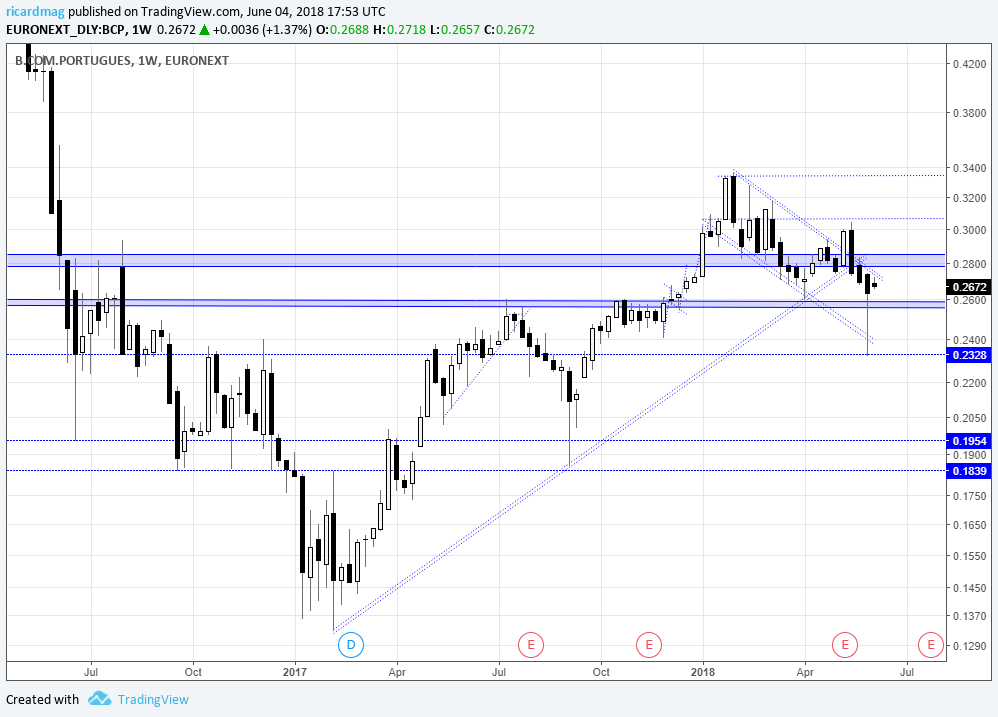 No entanto, na minha óptica, esse comentário deveu-se ao BCP ter quebrado o suporte 0,26 como manteiga e tendo-se aproximado dos 0,24 (tendo inclusivé chegado 0.2316) muito rapidamente. Neste cenário, caso quebrasse o suporte dos 0,24 estaria muito perto de uma inversão de tendência, sendo assim perigoso uma entrada longa, podendo muitos investidores "pagar para ver" e muitos outros preferirem aguardar um regresso aos 0,26 para confirmar que a tendência mantém-se bullish.