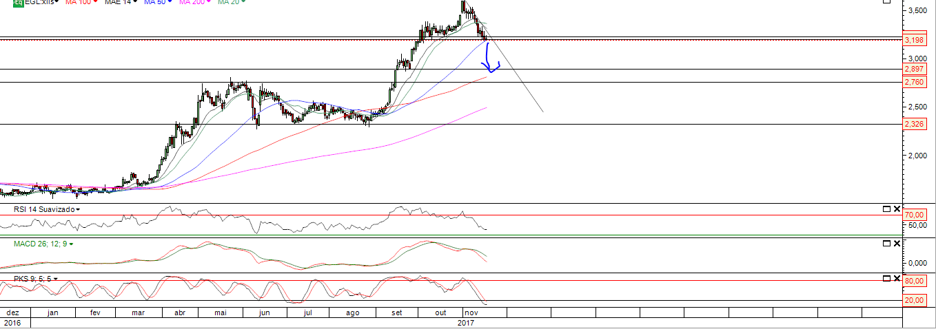 De qualquer forma a zona dos 2,90-3,00 é para se olhar com muita atenção, pois até aí, no meu entendimento, tecnicamente o título se mantém BULL se não houver uma quebra consistente nessa zona. Seria bom para o título, a se confirmar, que essa zona demorasse algum tempo para ocorrer, pois assim a consolidação seria mais eficaz.