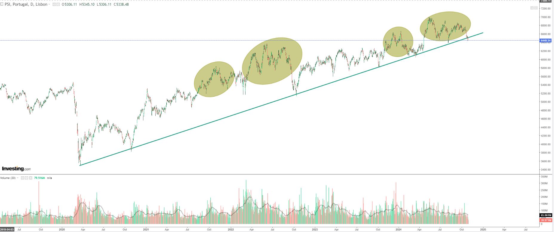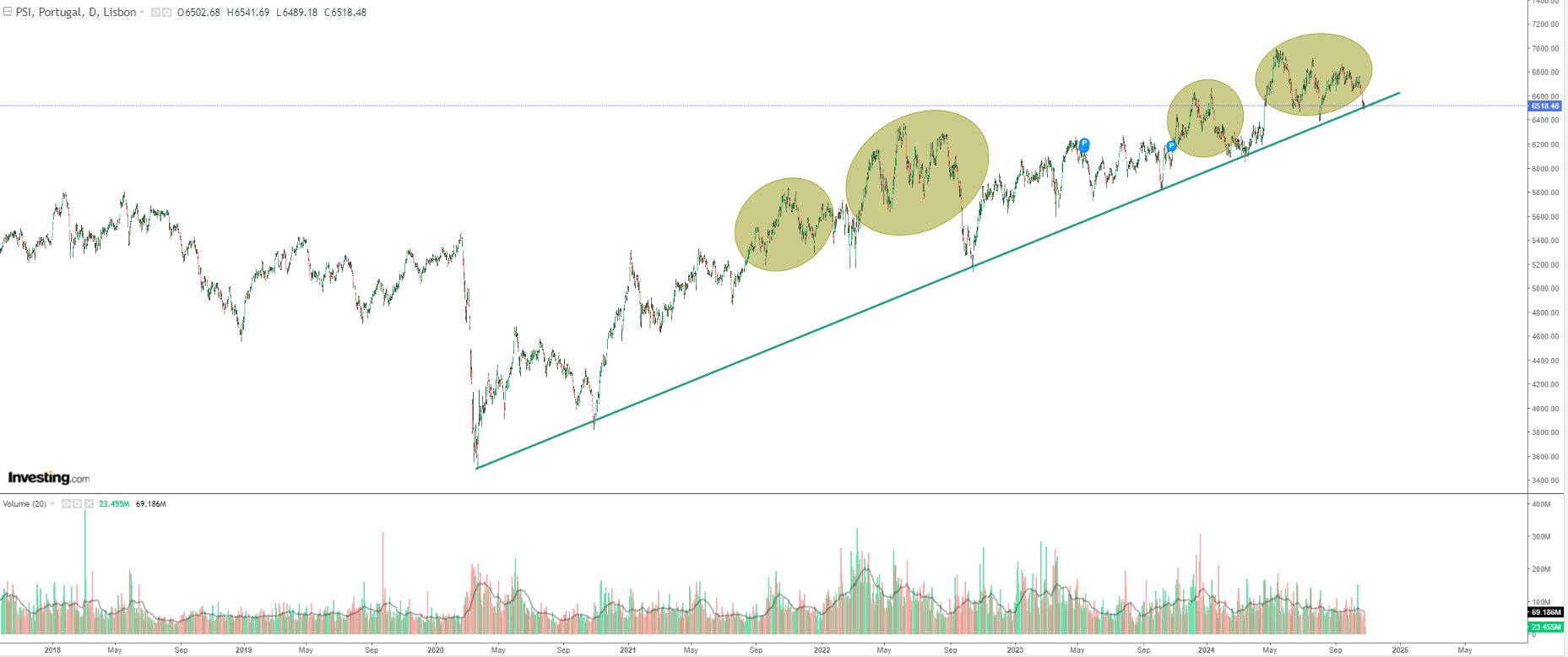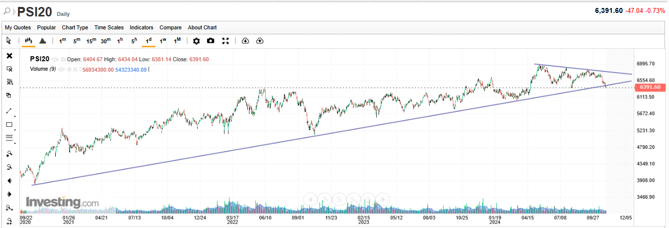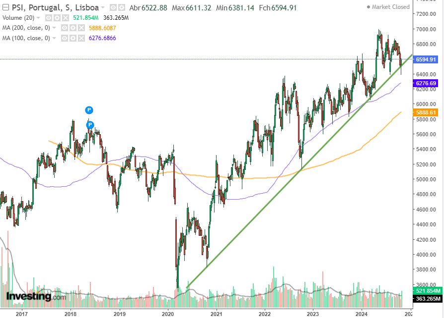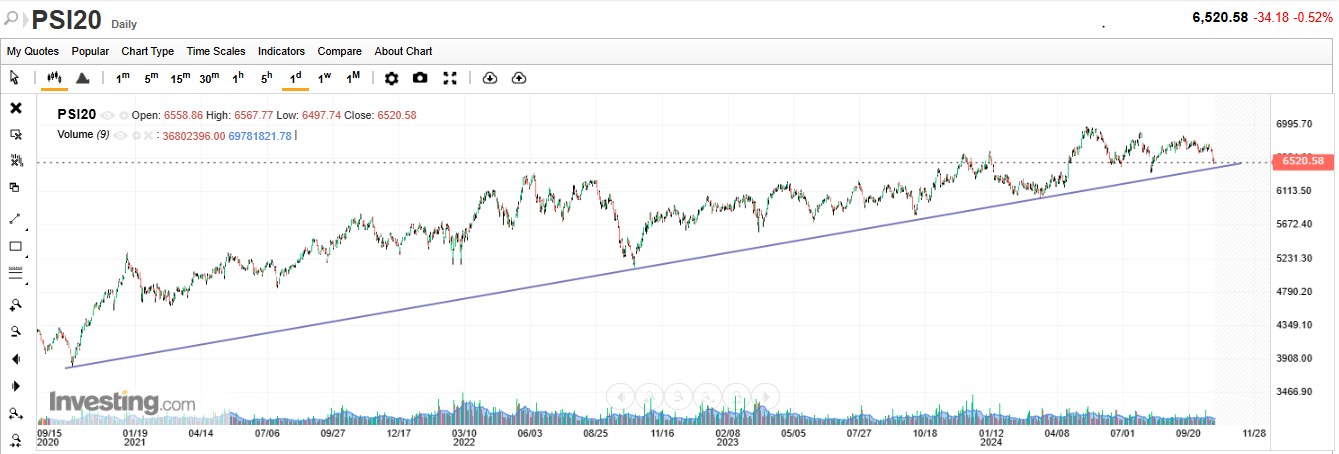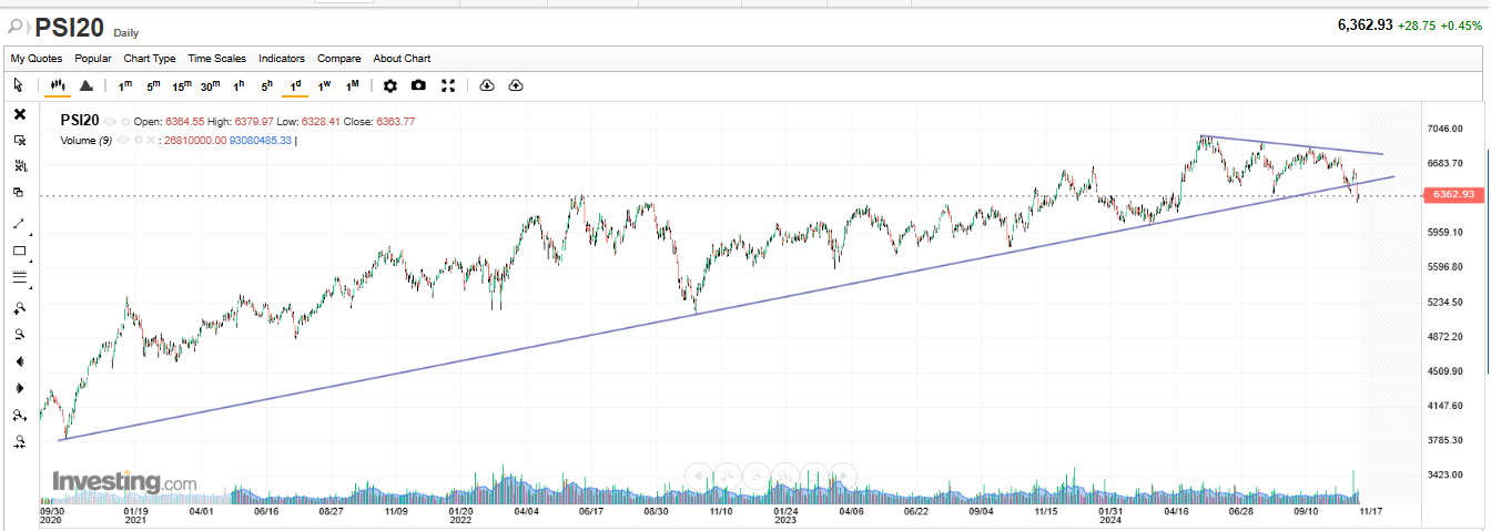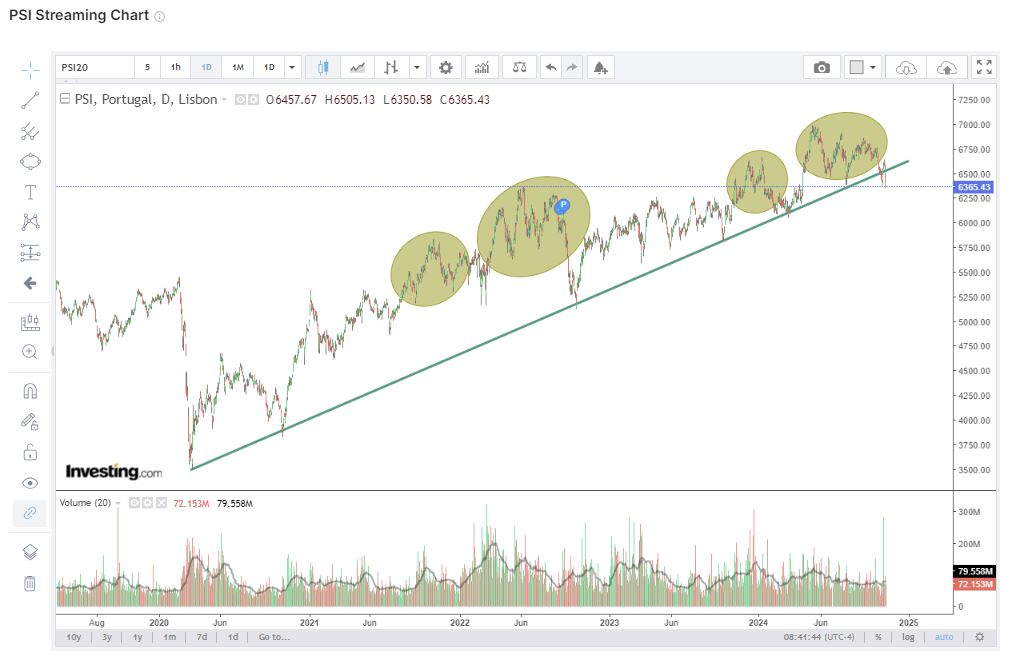 Não é verdade, anulou, sim, os ganhos desde abril, mantendo-se bem acima dos ganhos obtidos em março. Quantas vezes ao longo da sua subida o PSI 20 anulou ganhos obtidos antes? Faz parte da subida. Por exemplo, em setembro de 2022 anulou ganhos obtidos em agosto de 2021 e em maio de 2023 anulou ganhos obtidos em novembro de 2022. Isto não é sempre para cima!!! Com isto, não quero dizer, de forma nenhuma, que o PSI 20 vai continuar a subir!