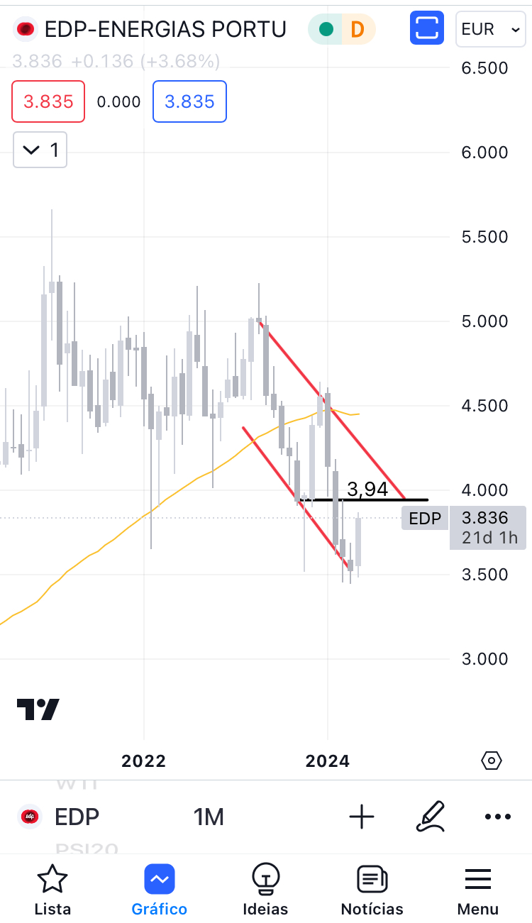 A MotA Engil está a subir hoje. Este é o gráfico mensal. Não dá para ver de forma perfeita, mas vê-se razoavelmente. As linhas preta e azul eram antigas resistências e agora são possíveis suportes. Parece estar a querer aguentar-se nas linhas de suporte para depois voltar a subir. Tinha dito que estava menos otimista e está ligeiramente abaixo, mas vou alterar para neutro. Estou mais otimista, mas digo neutro. No próximo mês, se ela se aguentar, provavelmente direi otimista.