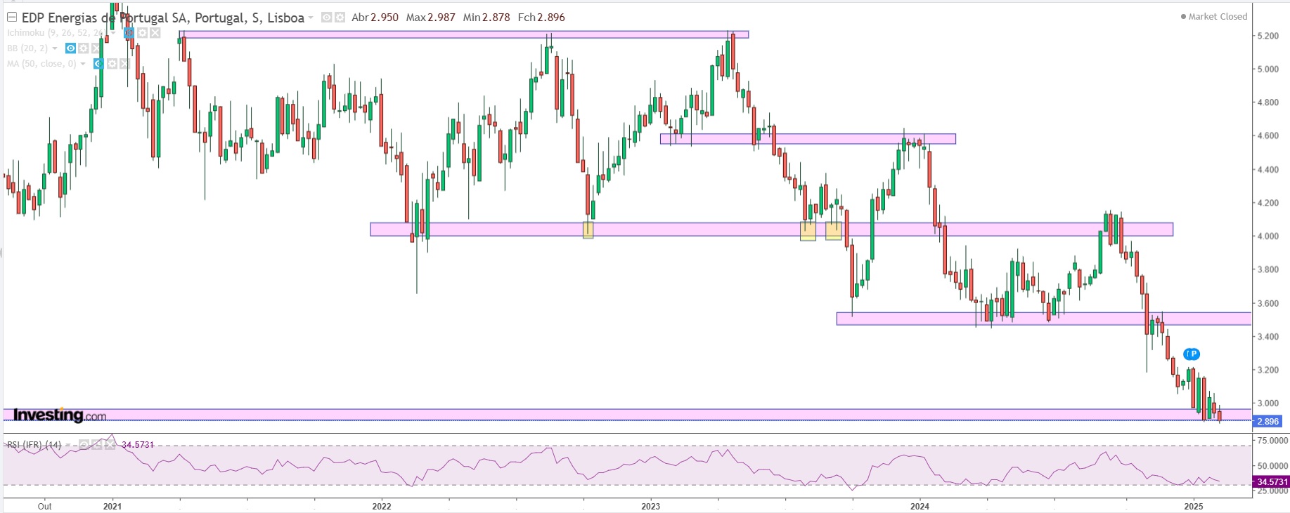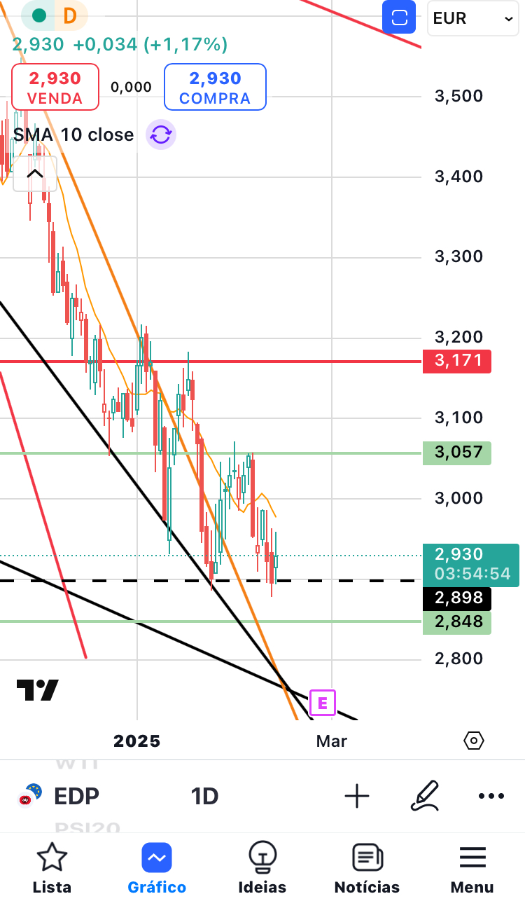 Tendo em conta o que o PSI tem feito nos últimos dias, com uma sequência de máximos e mínimos superiores e tendência ascendente, e o que os índices dos EUA estão a fazer hoje, além de o Eurostoxx 50 estar quase a fazer máximos históricos, acho que há uma boa oportunidade de a EDP, a EDPR e a maioria das ações portuguesas subirem. Quando um índice faz máximos históricos, como é o caso do Eurostoxx, isso pode contagiar outros índices. E quando os índices sobem, muitas vezes levam de arrasto ações que têm mais dificuldade em começar a subir. E a EDP tem importanciia no PSI, isso também joga a seu favor.