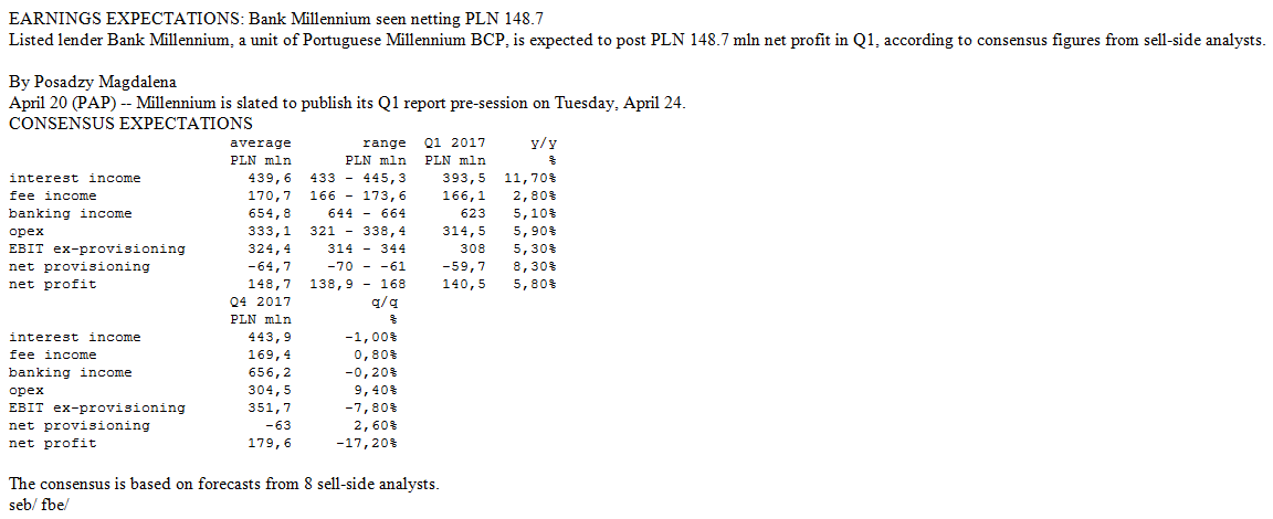 O Millennium Bank Poland apresenta os resultados do 1º trimestre de 2018 no próximo dia 24 de Abril, antes da abertura do mercado.