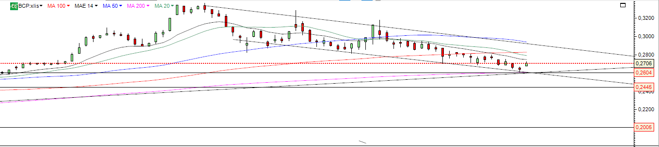 Agora enquanto ele afirmava o risonho futuro do BCP quando estava acima dos 0.30, já era visível a vinda á MM200 , LTA e 0.26.