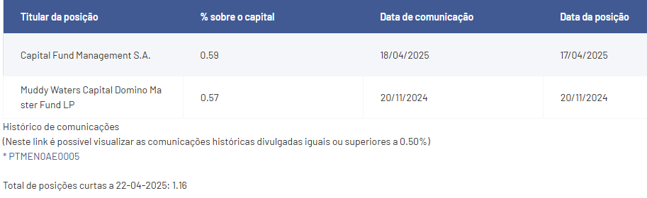 Na passada quinta-feira houve uma ligeira redução do short Capital Fund Management S.A., de 0.6% para 0.59%.