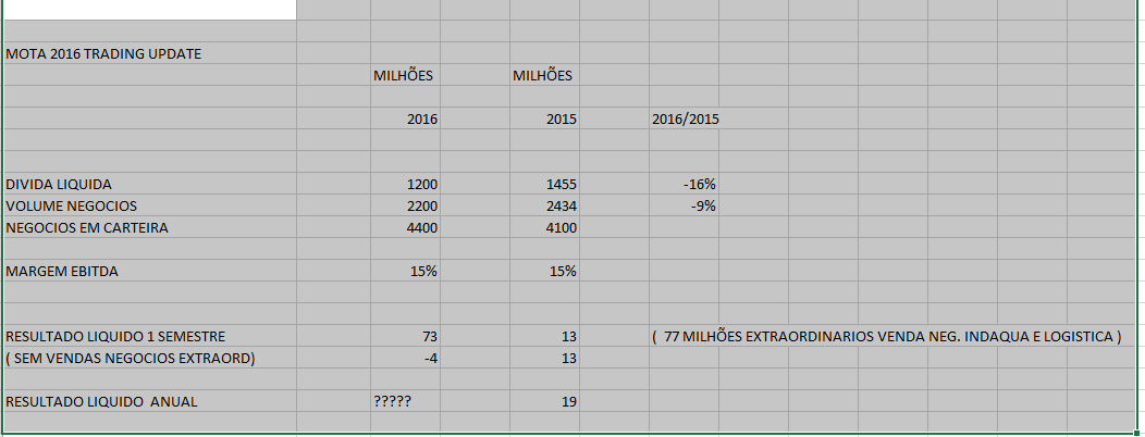 Não sendo espectaculares os resultados são ligeiramente melhores que os analistas previam . A diferença está na redução de dívida que a Mota efectuou (e direi eu muito bem!)