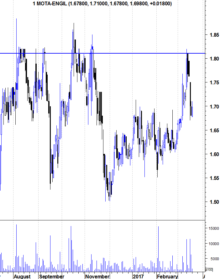 Aqui ficam os gráficos actualizados da Mota-Engil numa altura em que se encontra a namorar a sua decisiva zona de resistência.