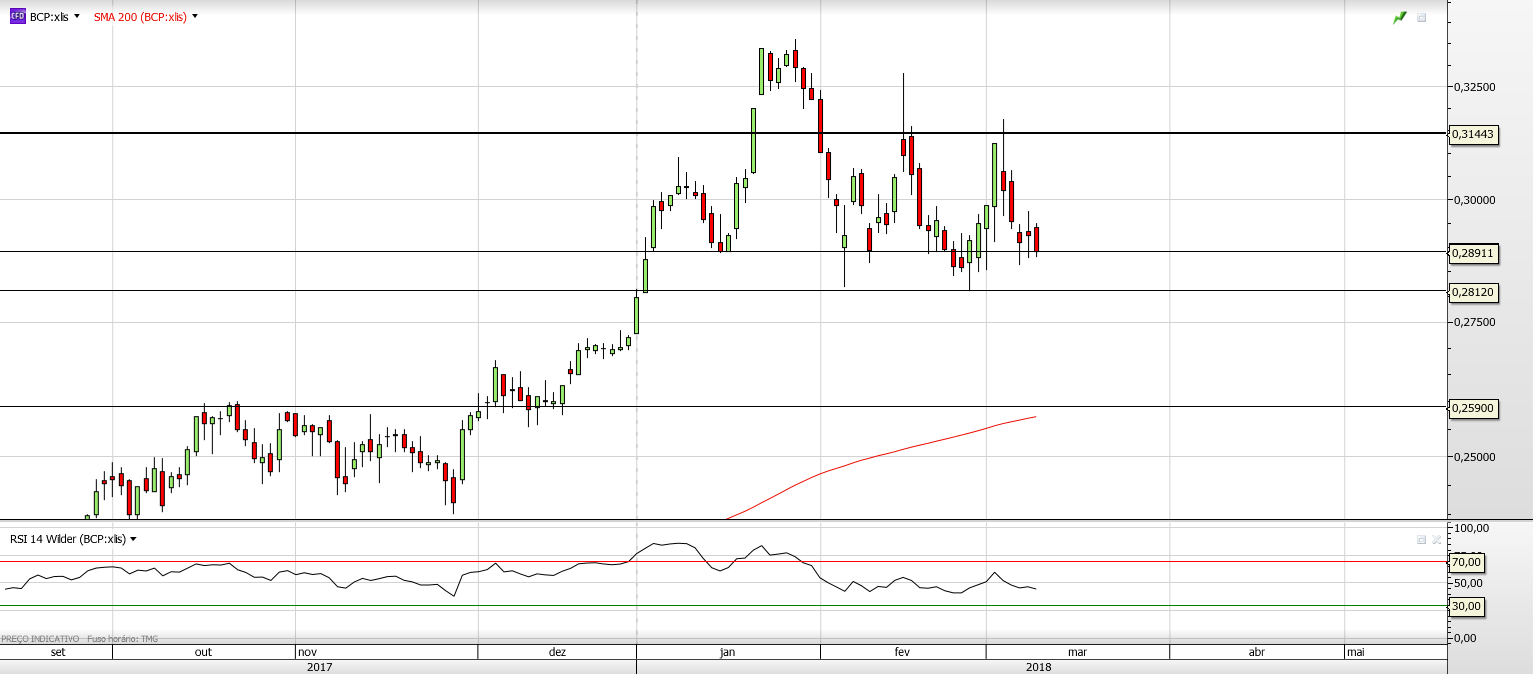 Nos proximos dias nao penso voltar ao BCP. Cotada sem demonstrar força há varios dias seguidos numa tendencia descendente, embora tenha estabilizado aqui nos 0,290€ que me parece ser uma linha imaginária que aguenta a cotada, ou um suporte designado por alguns. Tirando 2 picos, a 15 de Fev e a 2 de Março, repare-se que a cotada nao desce consistentemente dos 0,290€. Aqui sim parece o limiar/fronteira entre touros e ursos. Ta muito renhido e creio que so uma informação relevante sobre a cotada leva ela a sair destes valores. Este interesse na compra da CGD em Espanha é uma noticia negativa, como demonstra o historial de empresas que annciam interesse na compra de outras mas nao me parece que seja esta a razão da queda de 1% de hoje. A meu ver, apenas retornou à base (0,29€) depois da pequena valorização de ontem. Não está numa de valorização 2 dias seguidos. Mas tambem nao acredito que va visitar os 0,26 como aqui ja se disse pelas razoes referidas atras. Há muita gente longa que vai reforçar cada vez mais e pressionar a cotada em alta (entre eles grandes fundos) que nao vao deixar ela cair a esses valores e os shorts nao têm esse peso de a levar a esses valores.
