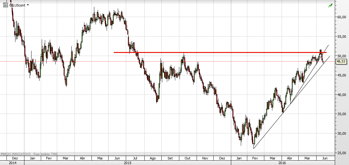 duplo topo quase a ser inviabilizado. não havendo duplo topo os $50 (WTI) serão quase certos no curto prazo.