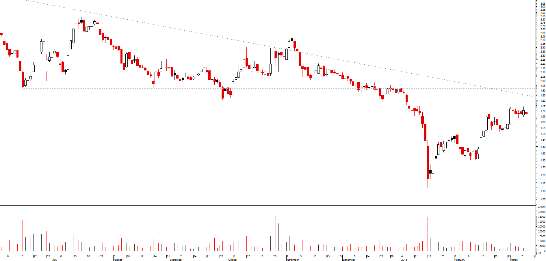 Se quebrar os 2€ de forma firme, acredito piamente que a Mota engrene uma rota ascendente e tem condições favoráveis. O preço do petróleo está a estabilizar e consequentemente a situação em Angola também. E, numa altura prévia de pagamento de dividendos, tudo leva a crer que a coisa aconteça. Vamos ver se rompe os 2€. No meu entendimento vai romper