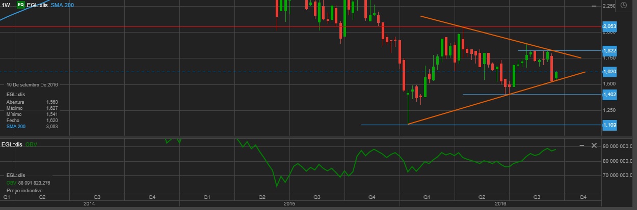 O triangulo está firme, com 3 toques em cada LT. No entanto, tem que rebentar na próxima semana ou começa a perder o seu power como figura de inversão. Os 1.82 devem definir o futuro da acção a médio prazo caso sejam ultrapassados, pelo menos julgo que a tendência descendente passa a consolidação.