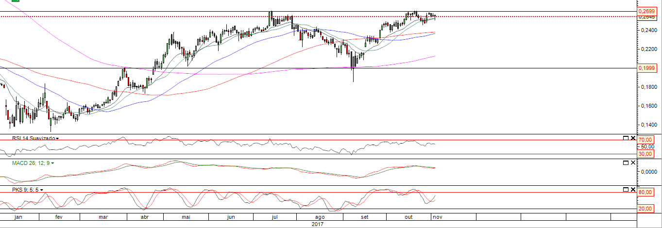 Aqui o mercado tem todo a mesma expectativa , supera os 0.26 e arranca para novo patamar ou não supera a resistência e corrige para patamares inferiores ?
