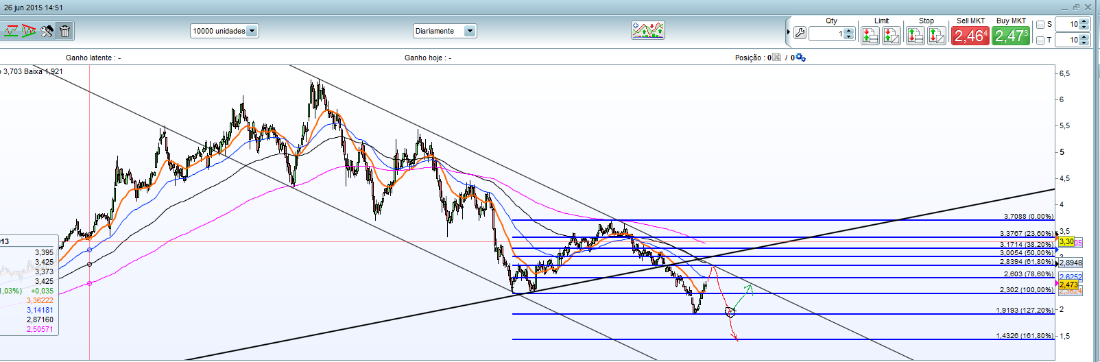Regressando aqui ao meu post em que dizia que ia até ao 1,91 (127,2%) agora diria que o final desta corrida pode estar, no máximo, nos 2,85 (TLD, 50% Fibo e topo de canal descendente no diário) com possivel regresso aos 1,91. Ai poderia fazer um duplo fundo ou cair para 1,43 (161,8% e minimo de canal descendente). Isso é a meta no caso de haver acordo este Sábado. Antes da quebra da TLD (actualmente nos 2,85) o caminho é deve ser de sentido único para baixo.