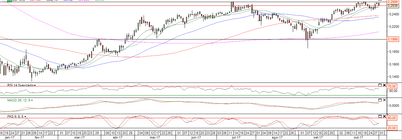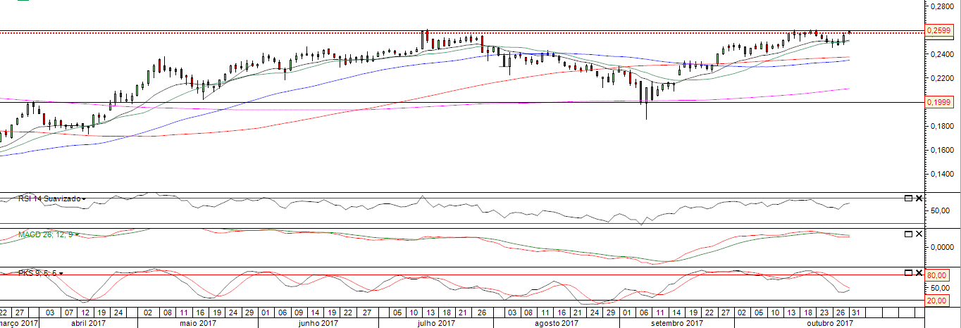 Acho que não recuou, ainda, o suficiente para fazer o assalto aos 0,26. E sem passar os 0,26 nada feito. Mas a figura de hoje foi interessante e desperta curiosidade para as próximas sessões.