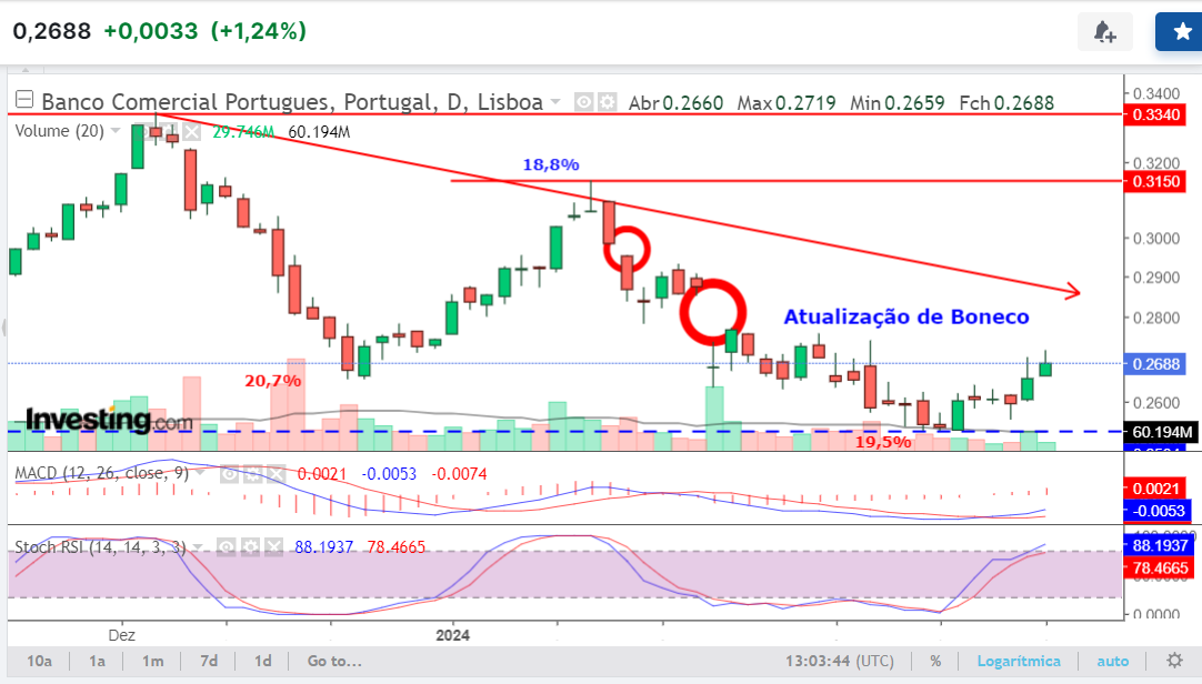Hoje voltei a comprar o BCP, durante a tarde pouco oscilou não deu para trading o que me quis parecer é que se subisse hoje poderia ficar esgotado rapidamente o target a que poderá ir até à apresentação de resultados, vamos ver o que nos reserva esta ação.