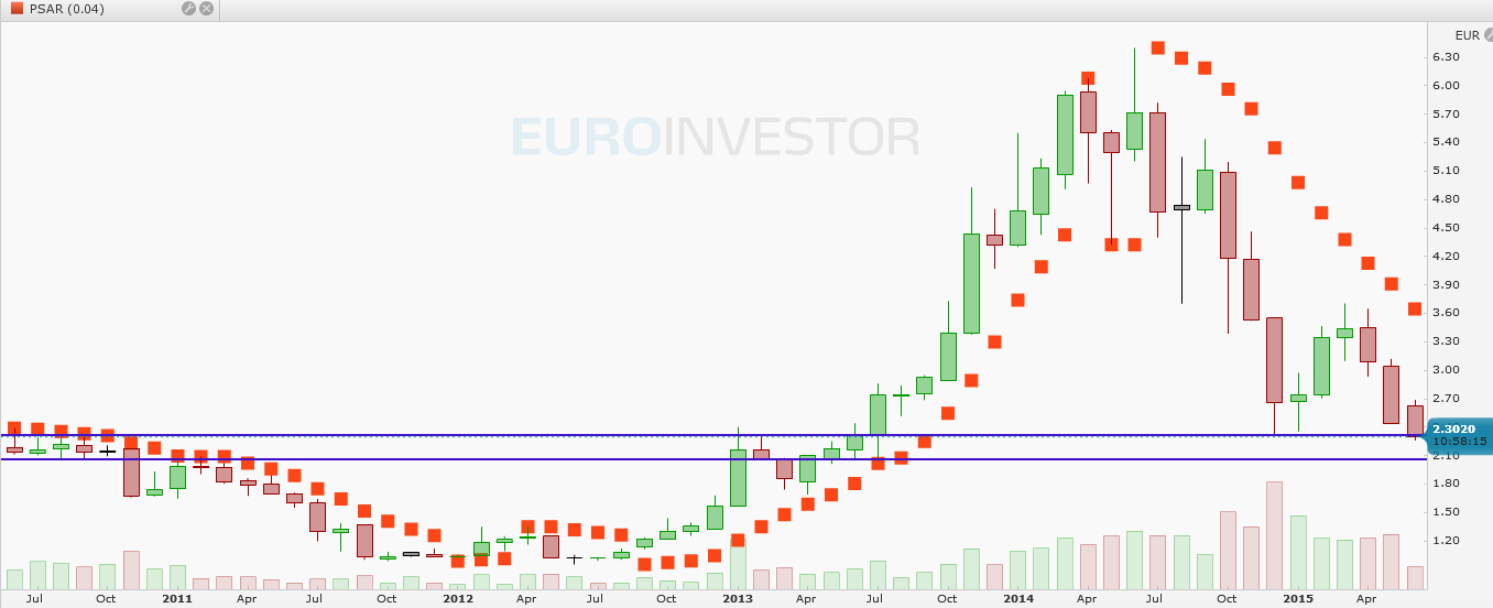 Ora então mais um gráfico, EGL mensal + parabolic SAR (quem diz que só serve para curto prazo