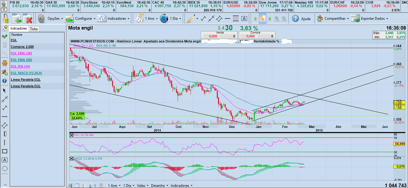 Queria só deixar aqui uma pequena critica a algumas análises que se têm vindo a fazer no tópico da Mota-Engil. Vejo vários gráficos: 15 min, 1h, 4h, ou seja super curto-prazo. Parece que estamos a analisar um par de forex. Julgo que trazem mais ruído do que sumo. Obviamente, é uma opinião pessoal, mas o mais útil seria ver gráficos diários ou semanais, pois as tendências não duram horas (o último bull da mota durou 2 anos!). Por último, não creio que seja uma vela horária na ME que nos vai dar um sinal de entrada ou saída.