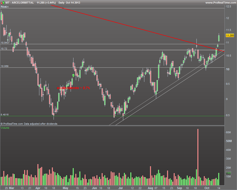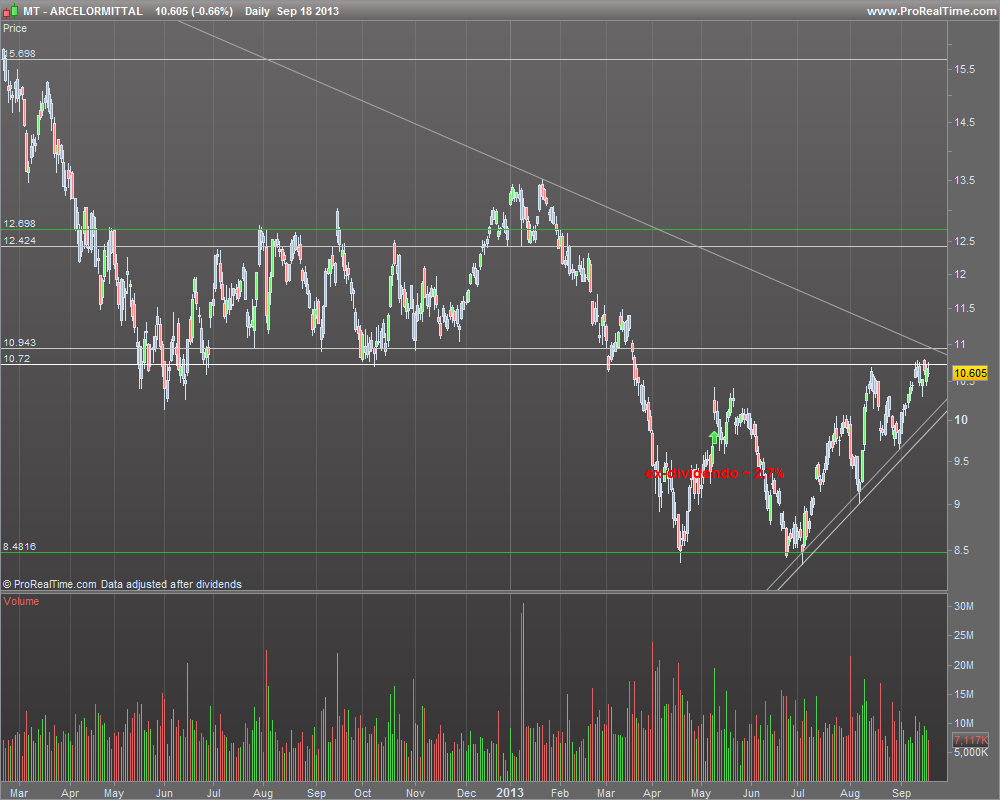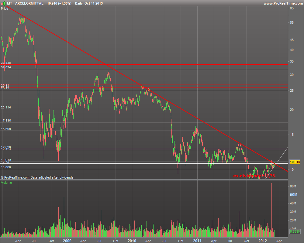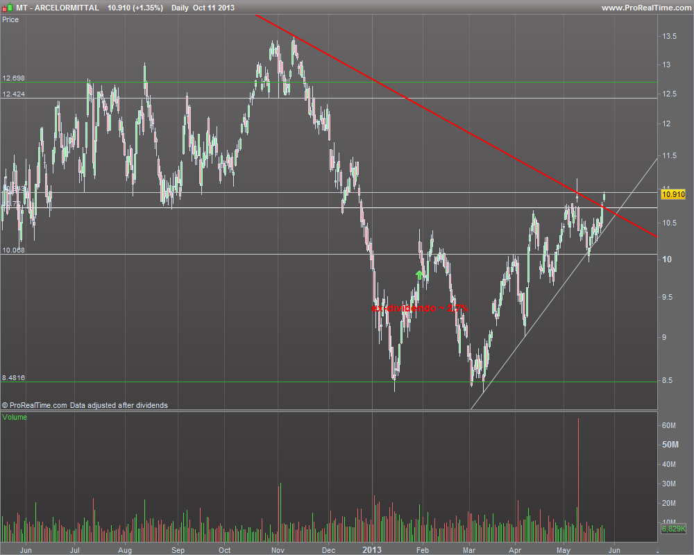 Parece-me que hoje há mais um sinal de possibilidade de alteração de tendência na MT. Cota a 11.06 (4.24%) com um volume de 7M às 10 da manhã, que é o volume médio das sessões do último mês. Esta cotação representa simultaneamente uma quebra da resistência entre os 10.7~10.9 e da LTd que vem de Maio de 2008. A confirmar-se é ainda o 4º higher high depois de 3 higher lows. Próxima resistência por volta dos 12.5. Vamos ver se se mantém neste patamar ao longo da sessão. Ficam os gráficos, link para a sessão de hoje aqui.