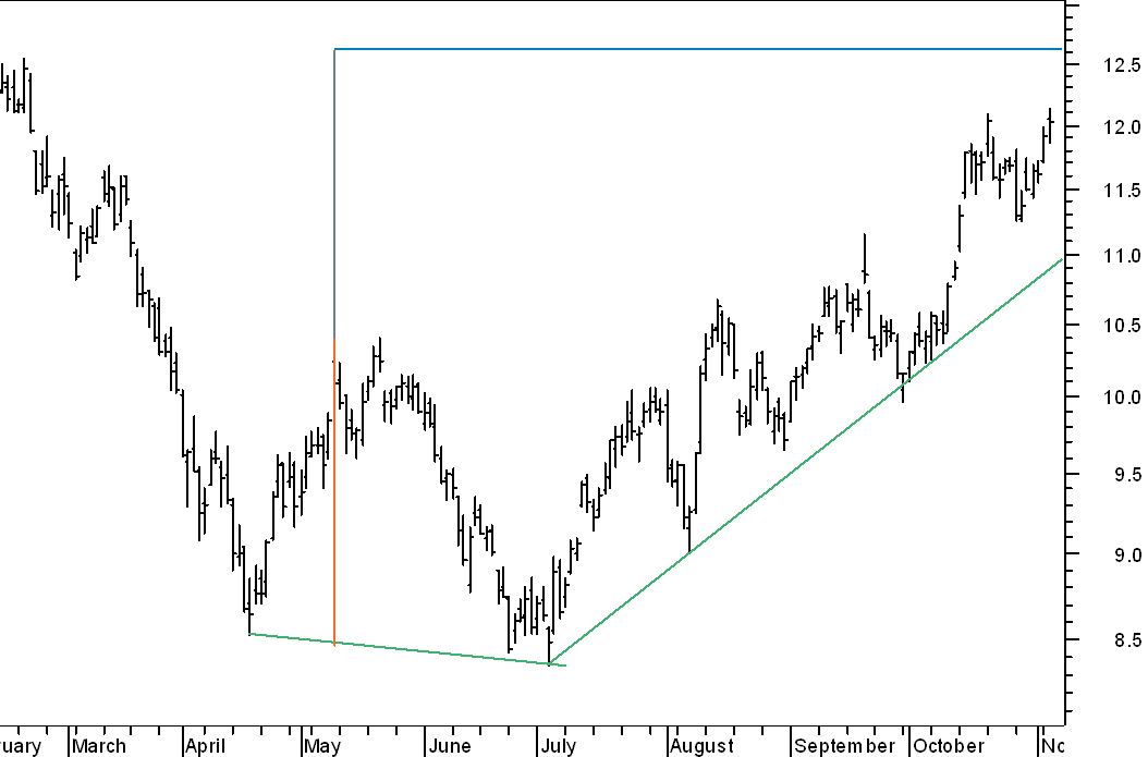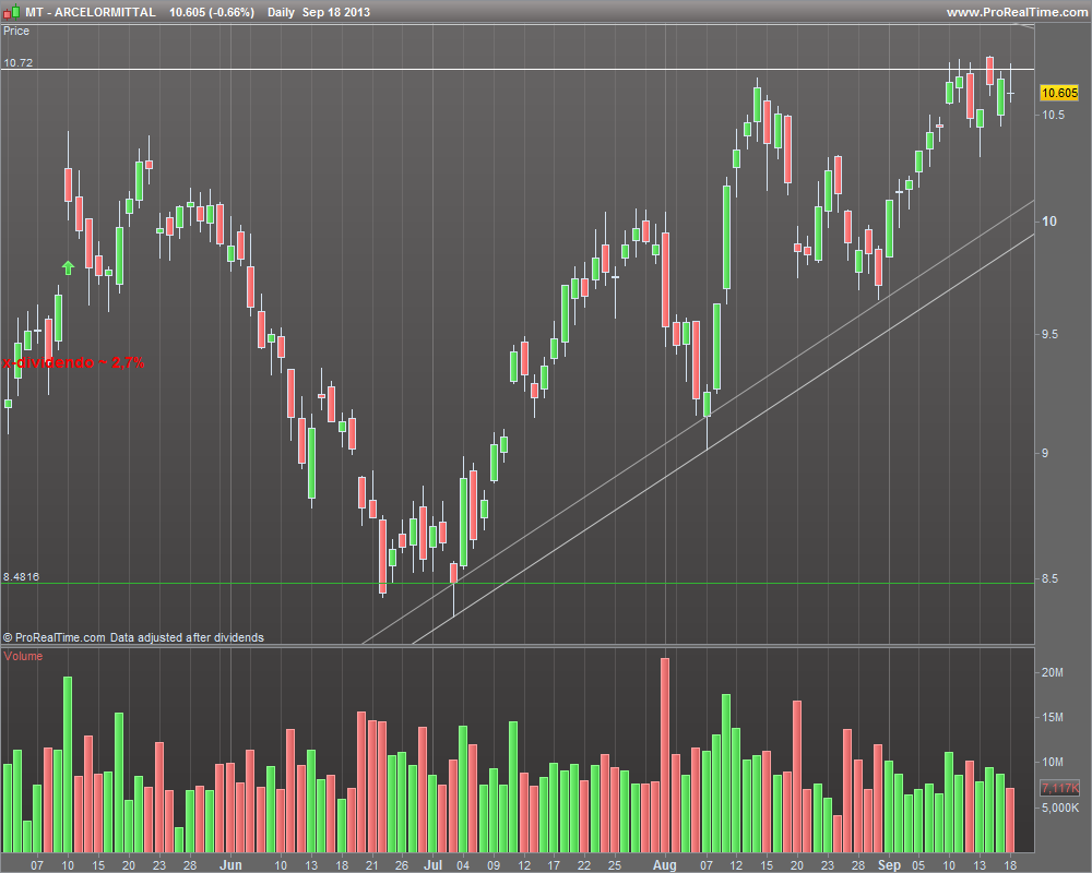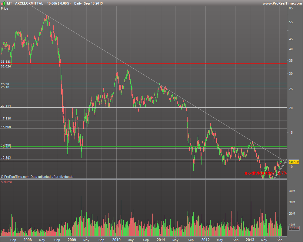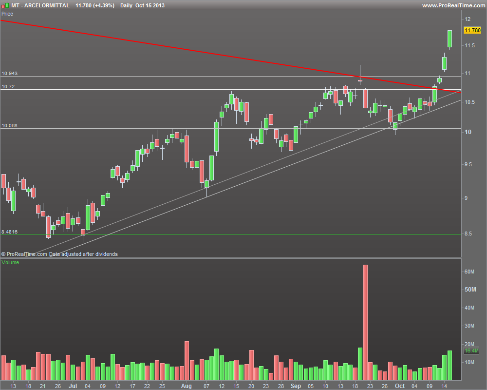 Parece-me que hoje há mais um sinal de possibilidade de alteração de tendência na MT. Cota a 11.06 (4.24%) com um volume de 7M às 10 da manhã, que é o volume médio das sessões do último mês. Esta cotação representa simultaneamente uma quebra da resistência entre os 10.7~10.9 e da LTd que vem de Maio de 2008. A confirmar-se é ainda o 4º higher high depois de 3 higher lows. Próxima resistência por volta dos 12.5. Vamos ver se se mantém neste patamar ao longo da sessão. Ficam os gráficos, link para a sessão de hoje aqui.