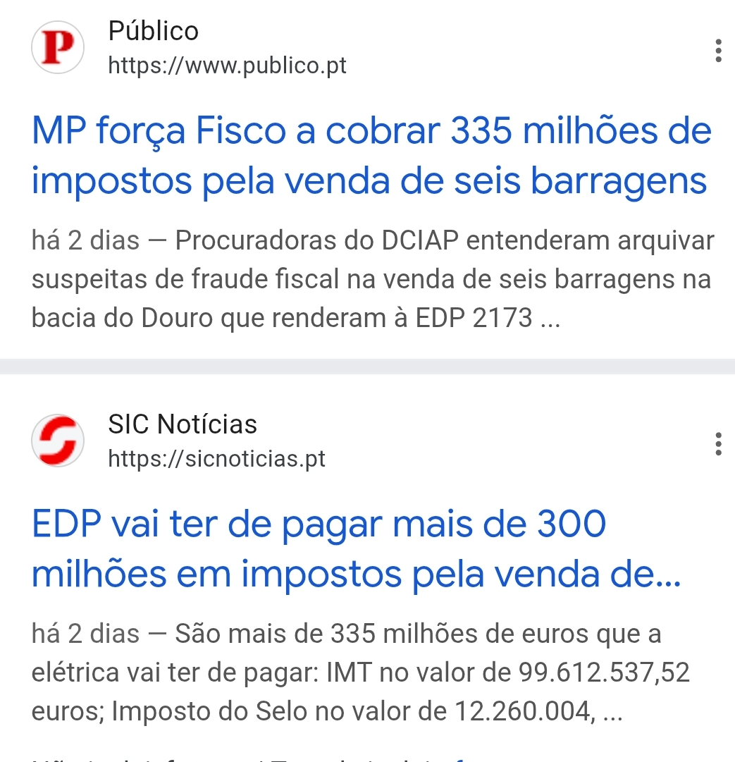 NirSup Escreveu:Dragon56 Escreveu:Realmente vivemos numa republica de compadrio politico e compadrio , eu como contribuinte ainda a mes passado tive que pagat ao fisco 7980 € de IMT + 1223 € de I.S, porque é que a EDP nao paga os impostos devidos da venda das barragens,??