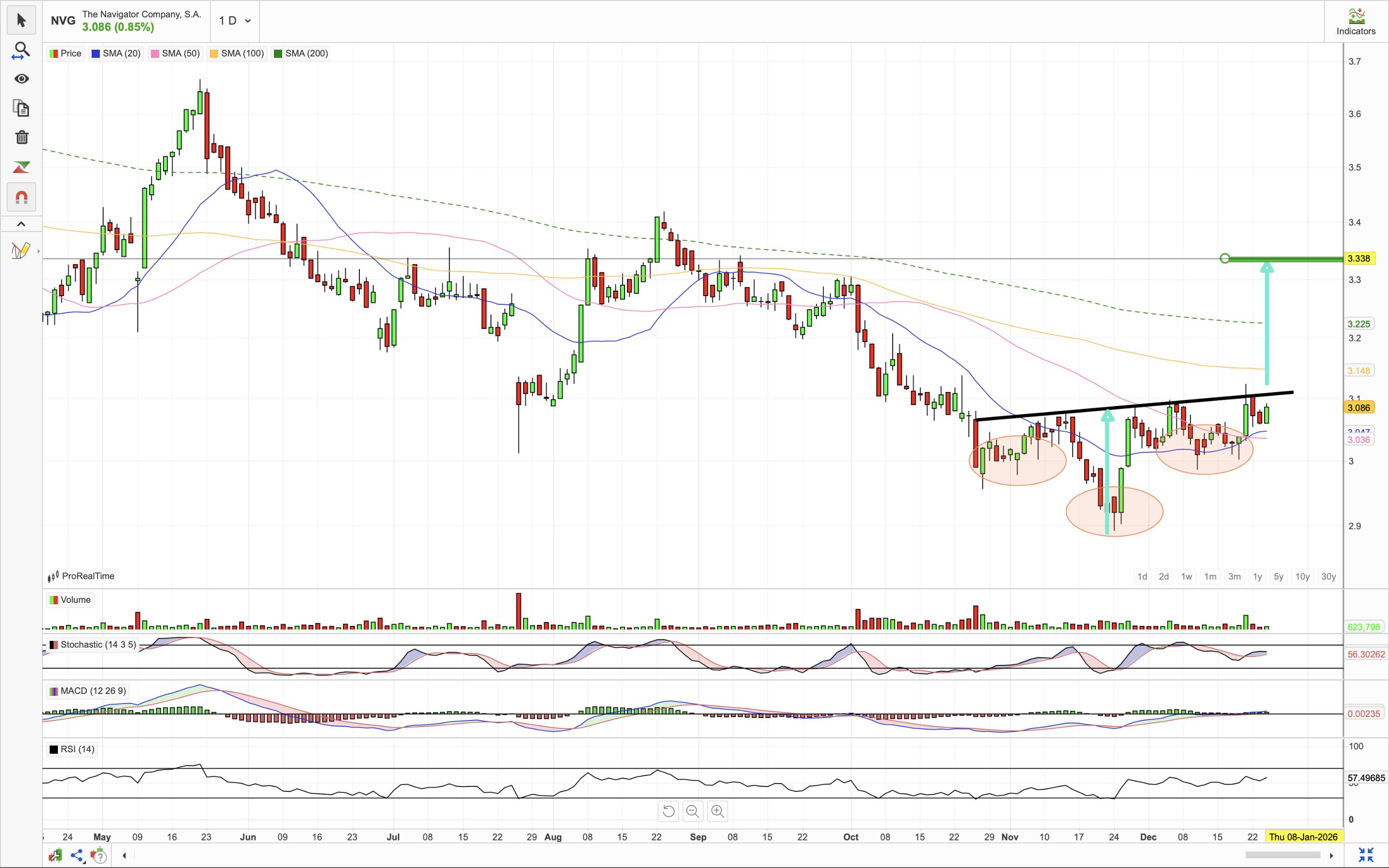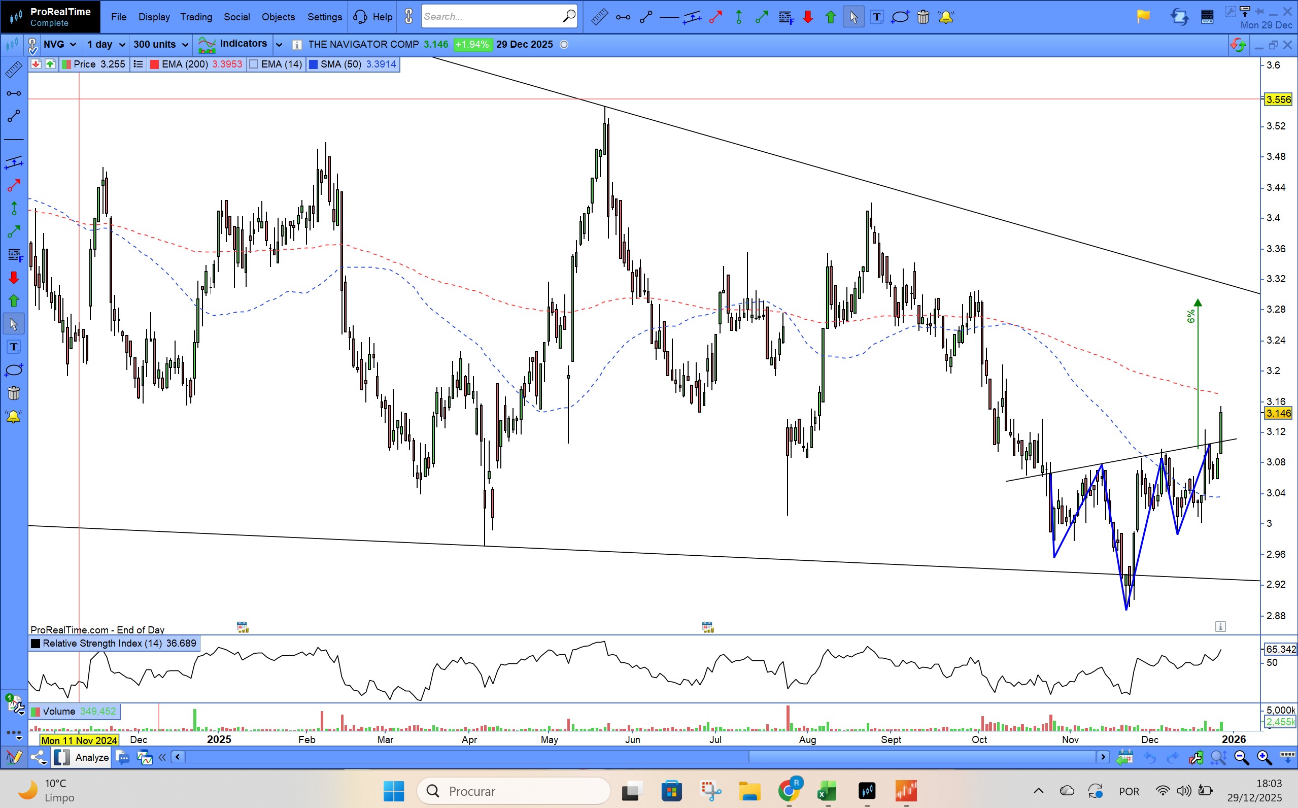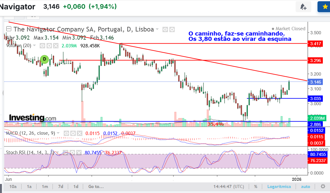 tecnicamente, se passar a zona dos € 3,09, com volume, irá directo ao anterior suporte, nova zona de resistência € 3,30.