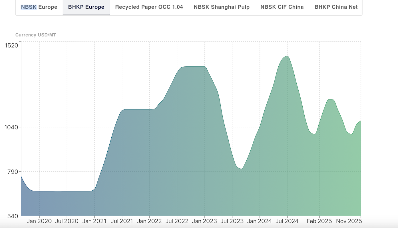 Preços das celuloses de fibra curta (BHKP) sobem em Novembro e Dezembro.
